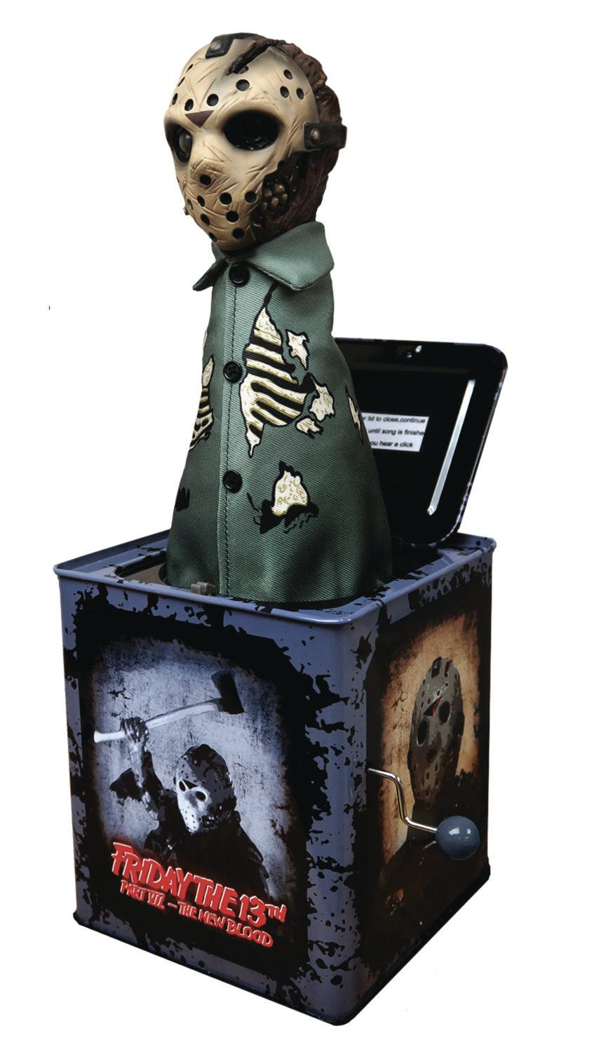 Jason Voorhees, the infamous Crystal Lake killer. Approximately 14" tall when "popped," the Burst-A-Box is a finely detailed tin music box that encases a detailed sculpt and clothed spring character. Designed after his appearance in the film, Jason features a cracked hockey mask, exposing the rotting monster underneath. Burst-A-Box: Jason Voorhees comes packaged popped-out of his tin and perfect for display in a collector-friendly window box.