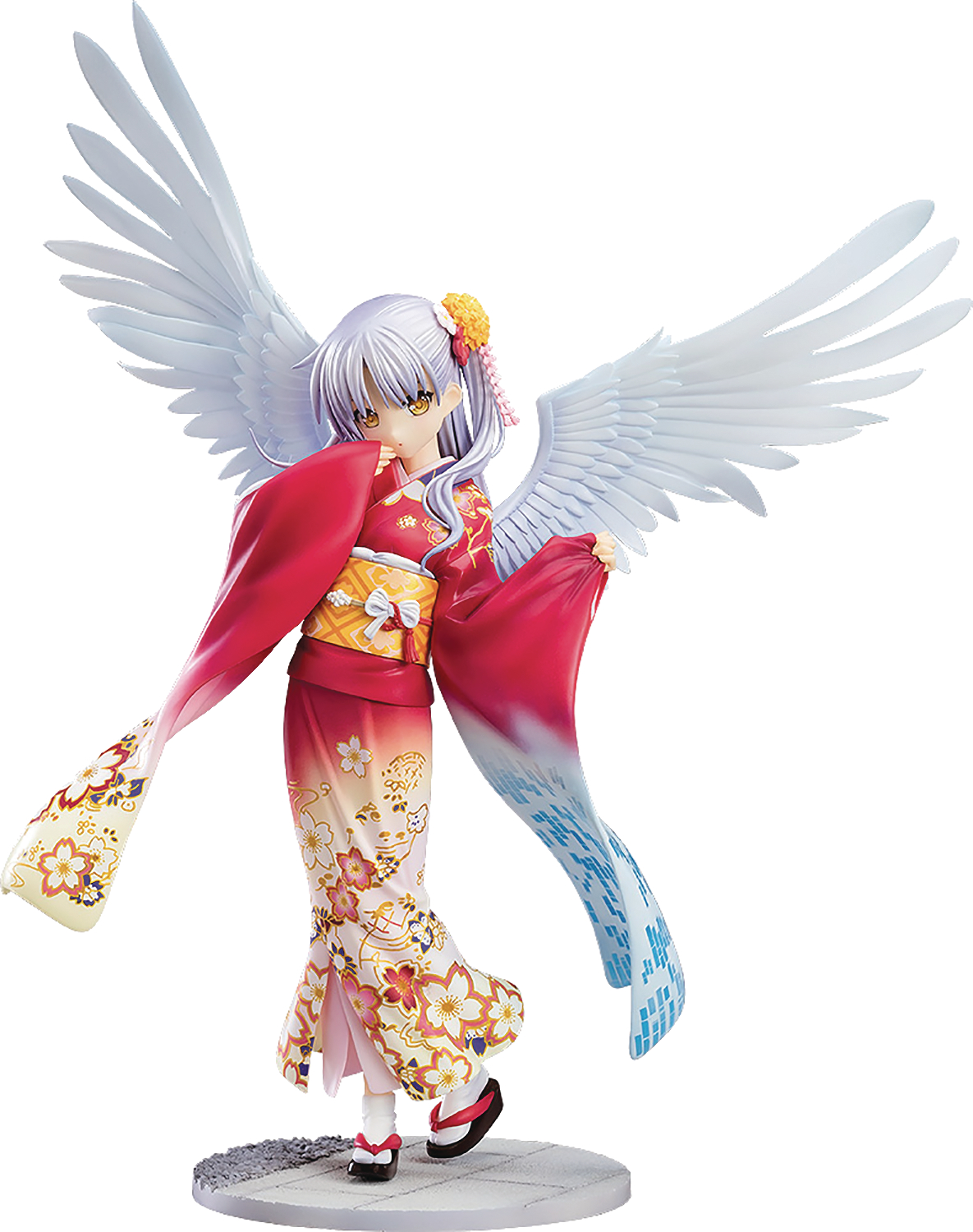Angel Beats! comes a 1/8-scale figure of Kanade Tachibana wearing a traditional Japanese outfit known as a haregi! The figure was made with assistance of Na-Ga, the original character designer of the series, who drew an original illustration which the figure was based on.The vivid red outfit is decorated with various embroidered flowers, while Kanade herself stands in a cute pose with a shy look on her face. Her large angel wings extending from her back as well as the long sleeve on the left make use of semi-translucent parts.