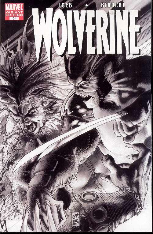 From Marvel Comics. A special variant edition with a black & white cover! Superstar Jeph Loeb is joined by future superstar Simone Bianchi for the biggest, best and, quite possibly, last battle between Wolverine and Sabretooth! These sworn foes have been locked in an endless grudge match that goes back longer than either can remember - or even imagine. The key to victory is eons old, and it's certain to rock their world. It's time for round two - at thirty thousand feet. As Logan and Creed continue to up the ante on their latest death match, a third party lurks outside the ring. An entity whose power, guile and sheer iron will is unlike anything either has encountered. Scheduled to ship 02/28/2007. (161).