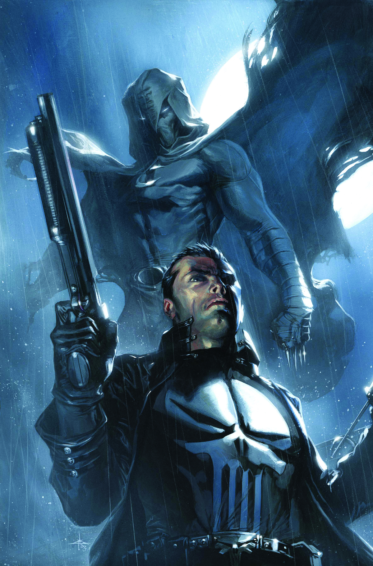 Out of the frying pan...into the inferno. Marc Spector may be dead, but Moon Knight is very much alive. Hiding out in the dark underbelly of Mexico City, trouble quickly finds the fugitive vigilante when a mysterious millionaire begs him to ensure the safe return of his kidnapped daughter. Problem is, the girl is in the clutches of corrupt cops that are currently in the crosshairs of a vigilante whose methods make even Khonshu blink. The Punisher has come down to Mexico, and God help anyone who gets between him and his prey.
