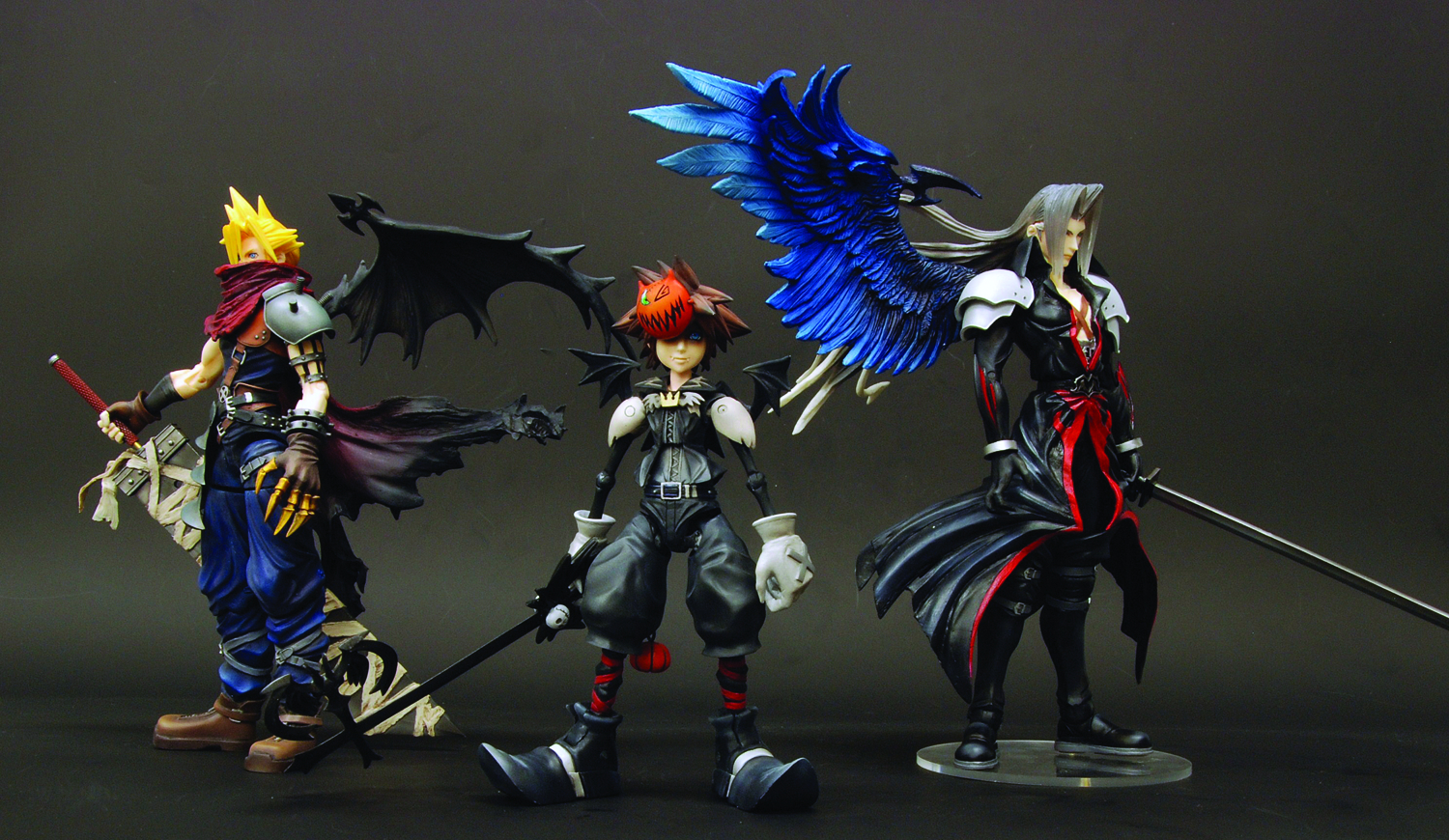 Imported from Japan! Disney and Square Enix teamed to create Kingdom Hearts, the fan-favorite role-playing game that combined the characters of Disney with the worlds and style of Final Fantasy. The characters from the best-selling original game are crafted as the Kingdom Hearts Play Arts action figures. Cloud, the hero of Final Fantasy VII, stands 7 3/4" tall as he appeared in the world of Agrabah. Sephiroth, the villain of Final Fantasy VII, appears as he did in the Arena worlds of Kingdom Hearts and stands 8 5/8" tall. Finally, Kingdom Heart's hero, Sora, stands 6 3/8" tall in his "Halloween Town" form, appearing as he did when he ventured into the world of The Nightmare Before Christmas. Each figures comes with weapons and accessories taken from the game.