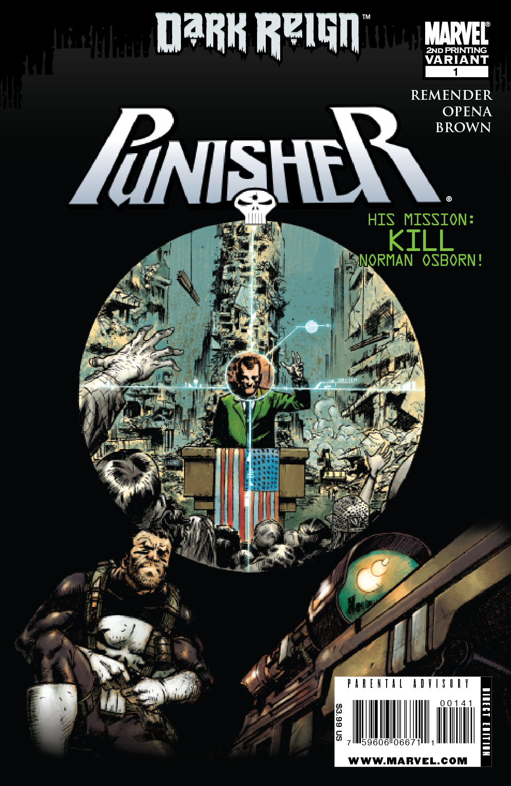 From Marvel Comics. LIVING IN DARKNESS," PART 1 -- The fight against the "Dark Reign" begins. One man with one bullet, in the right place, at the right time, can change the world. That's why the Punisher is perched atop a building on the Jersey shore with a high-powered Skrull rifle, his crosshairs trained on a target in Midtown Manhattan. But who is his target -- and why? One thing's for sure: They're anything but helpless. Someone is watching their back. Someone big. Enter: The Sentry! Scheduled to ship 02/11/09. (161)