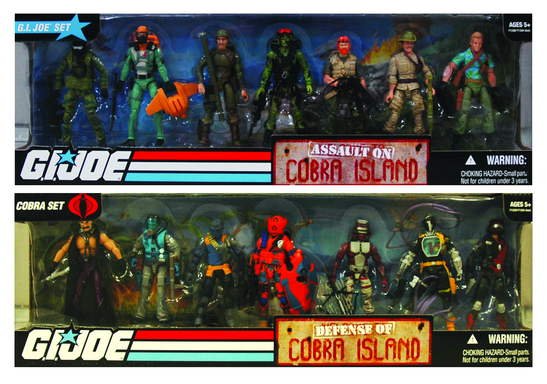 The headquarters of Cobra are under attack, and with these action figure packs, fans of G.I. Joe can either storm the beaches of Cobra Island to secure freedom across the globe, or they can defend the shores of Cobra Island from the invading forces of G.I. Joe and survive another day, a day that might lead to world domination! On the G.I. Joe side, collectors will find Freefall, Wetsuit, Hit & Run, Chuckles, Zap, Recondo, and Outback. For the defense of Cobra Island, collectors will find Strato Viper, Night Creeper, BAT, Lampreys, Alley Viper, Range Viper, and the insidious Dr. Mindbender. Each pack contains 7 figures of either the G.I. Joe team or Cobra, with each figure at the 3 3/4" scale. Defend Cobra Island, or take Cobra down, with these window boxed collector sets.