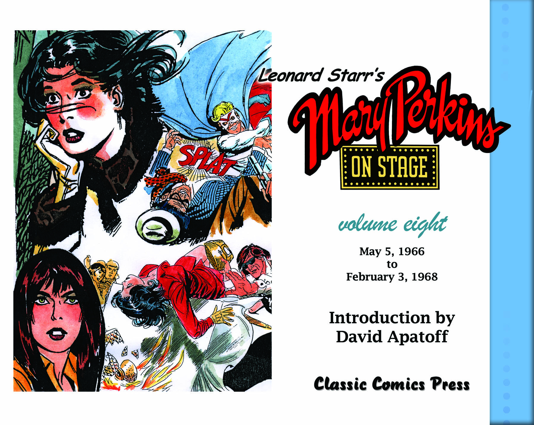 Leonard Starr's Mary Perkins on Stage, reprinting daily and Sunday comic strips originally published between May 5,1966 to February 3, 1968, with an introduction by David Apatoff. Storylines include the return of Russian Major Volkov, the devious doings of Vanna Croy, Johnny Q, and the Fletchers as guests at the home of movie director Renzo di Saba.