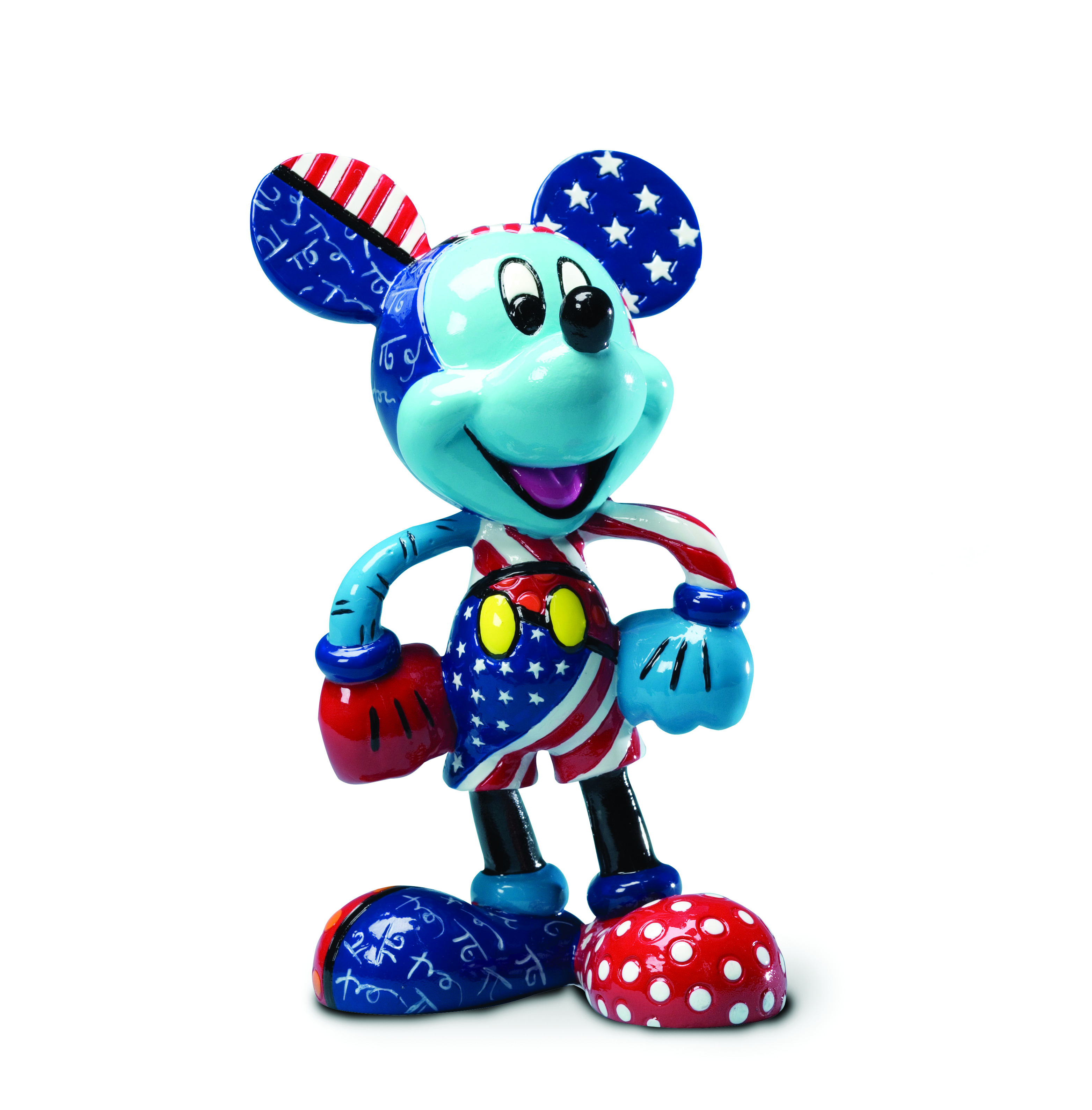 Contemporary artist sensation Romero Britto interprets Disney's most beloved and iconic characters in this stylishly bold new collection. Here Britto applies his dynamic modern designs in the patriotic scheme of Old Glory herself. The red, white, and blue motif is applied both in a hand-painted figure and the iconic "mouse ears" shape lidded box which opens to reveal a small storage space. Crafted of polystone with glossy finish, both figure and box stand about 4" tall and offer a three-dimensional canvas for Britto's bold expressions. Offered separately. Look for more in this artistic series to collect and enjoy.
