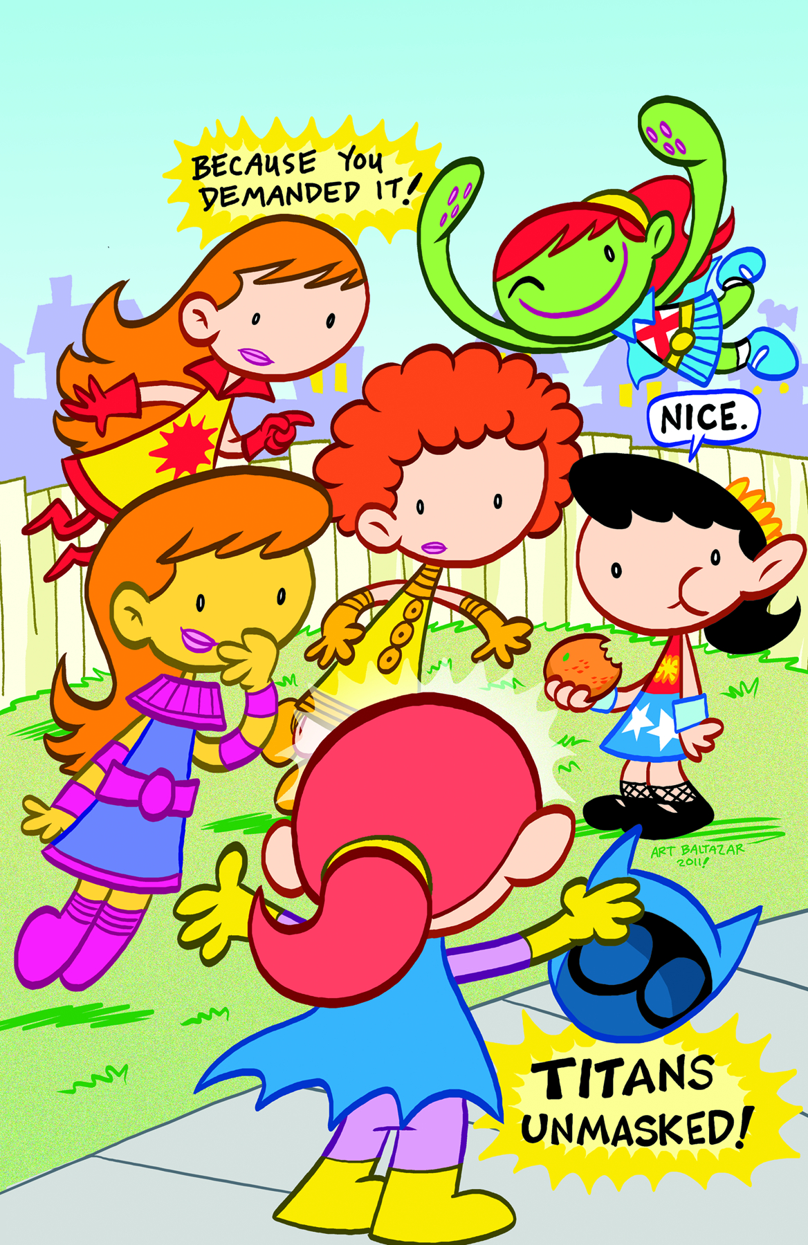 Because you demanded it - Tiny Titans unmasked in a special all red hair issue! Barbara! Miss Martian! Starfire! Blackfire! And Speedy! Actually, Speedy's hair is more of an auburn. Also, what's Wonder Girl's secret? What is she doing with all that fruit? A discovery is made when she reveals her secret oranges!