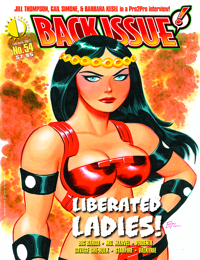 Now in Full-Color! Back-Issue #54 gives equal time to "Liberated Ladies," eyeing the female characters that broke barriers in the Bronze Age: Big Barda, Valkyrie, Ms. Marvel, Phoenix, Savage She-Hulk, and the sword-wielding Starfire. Plus, a "Pro2Pro" interview with creators Jill Thompson, Gail Simone, and Barbara Kesel. Featuring art and/or commentary by John Byrne, George Perez, Jack Kirby, Mike Vosburg, and more, with a bombastic Big Barda cover by Bruce Timm!