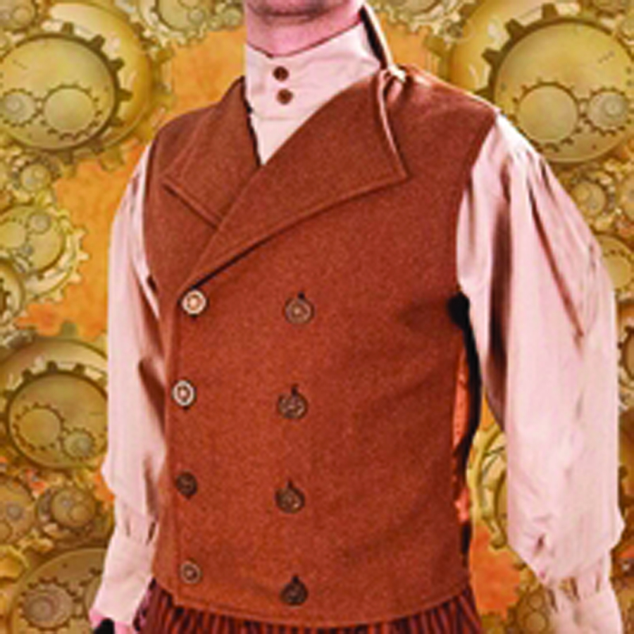 This tan engineer vest has a twill wool front and a satin back with an adjustable strap. The high rear collar and the eight antiqued brass buttons make this double breasted vest a real Steampunk beauty!