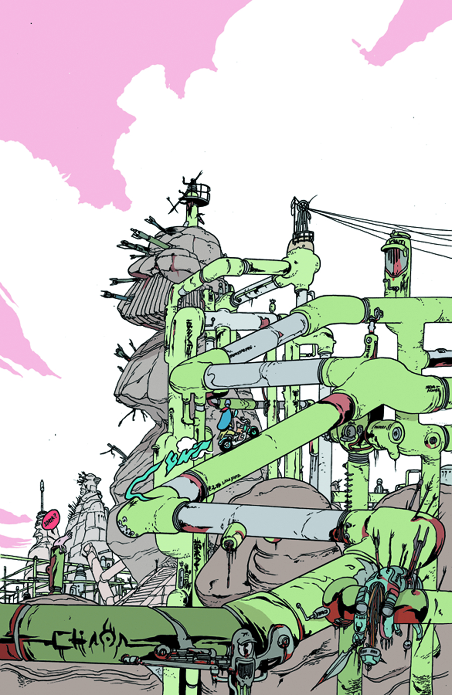 Blue Nura chases her prey across a mass of pipes built high above the earth past a Sphinx and into a town built onto the back of a Whale.