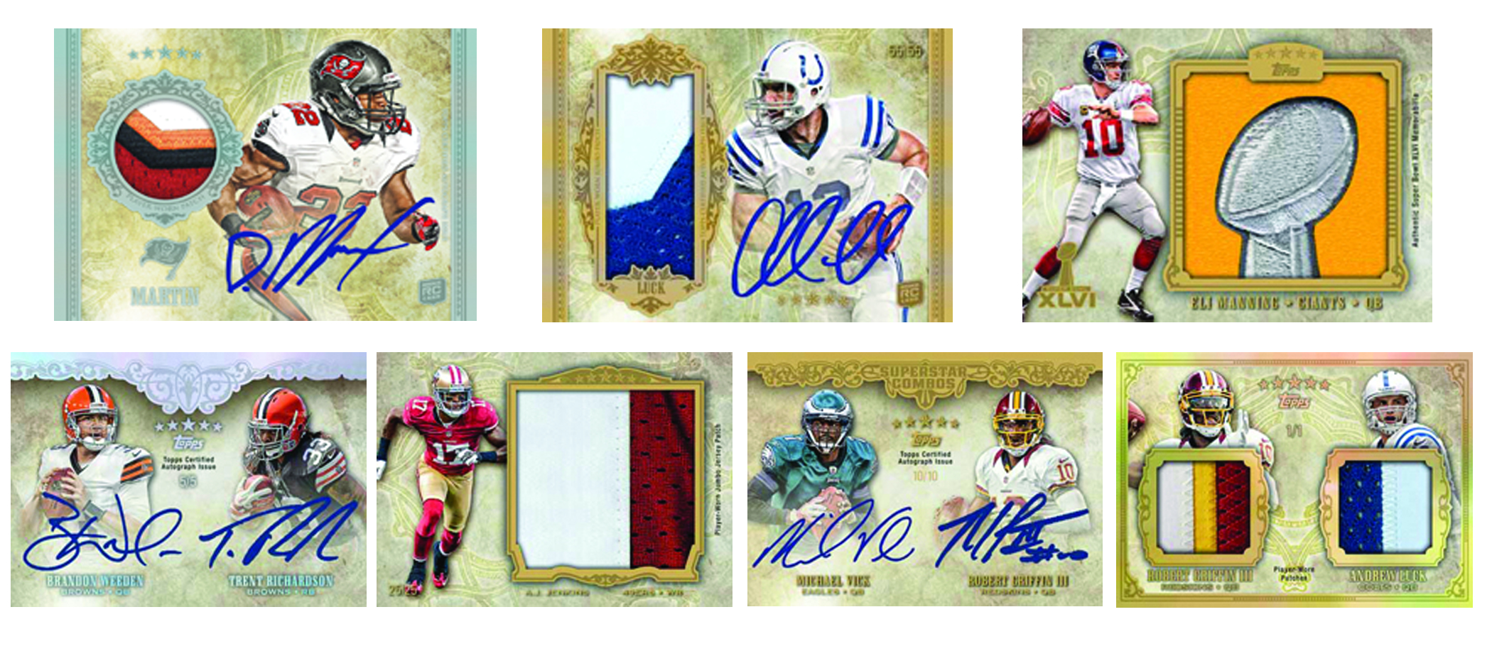 Five Star Football returns, bigger and better, with more patches, the all-new "Rookie Yearbook" cards, and "Five Star Giants"! Every pack includes 3 base cards, 1 Base Rookie Autographed Patch Card, 1 Autographed Rookie Card, 1 Autographed Veteran/Retired or Autographed Patch Card, 1 Autographed Relic Book or Dual Autograph Card, and 1 Jumbo Jersey Relic or Patch Card! All Autograph and Relic Cards are distributed in varying color-levels of rarity, numbered to 55 or less! Also look for Rookie Autograph Redemption Cards, Andrew Luck & Rober Griffin III Autograph Continuity Program, Rookie Yearbook Card, and "Luck and Griffin-Five Star Giants" oversized framed/autographed cards! One pack per box. Three boxes per case.