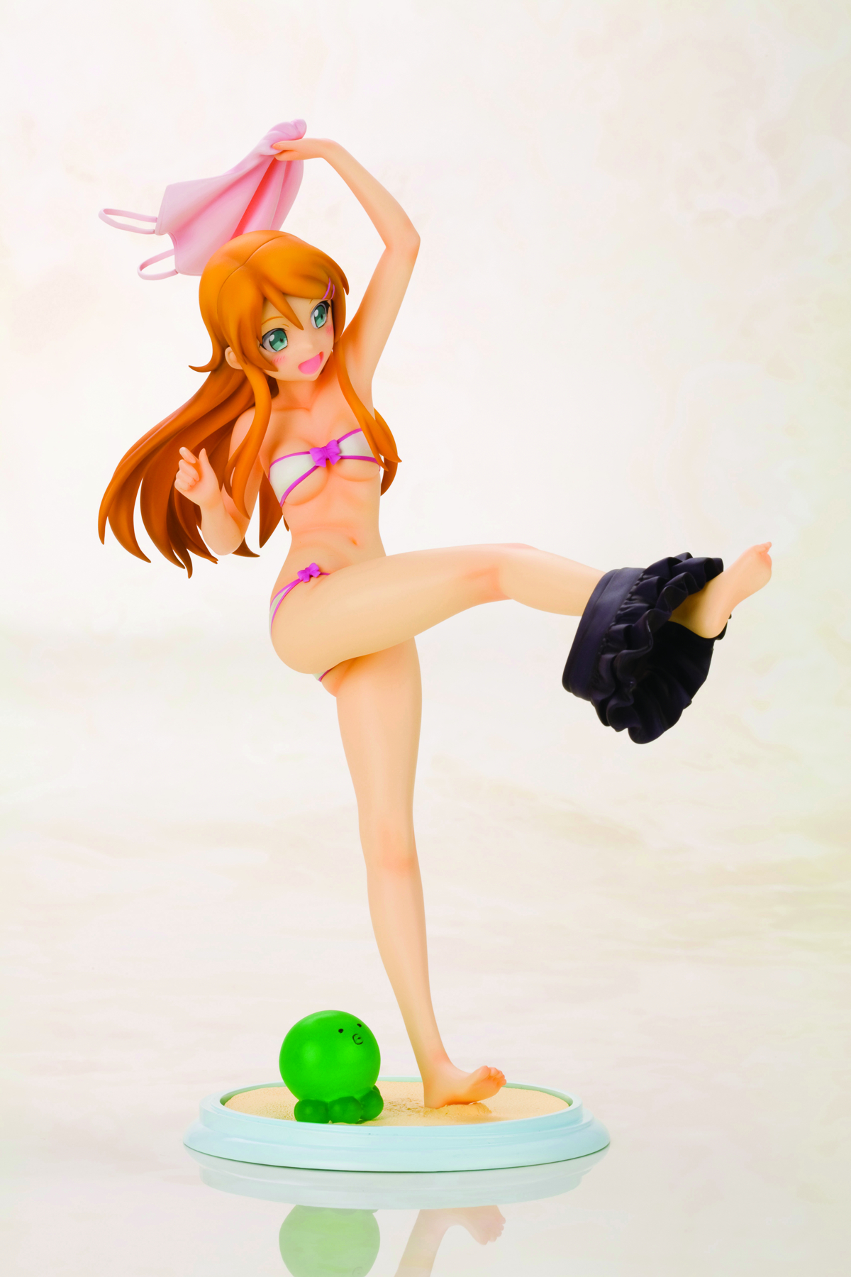 A KOTOBUKIYA Japanese import! Next up in the Ani*Statue lineup from the popular Ore no Imoto ga Konna ni Kawaii Wake ga Nai ("My Little Sister Can't Be This Cute") franchise is another new version of the secretive and mature young girl KIRINO KOUSAKA -SWIMSUIT VER-. This time she's out enjoying a day at the beach! Eagerly racing toward the water, Kirino balances on one foot as she kicks off her black skirt and throws her pink top behind her. The fluid motion of the pose really brings the statue to life, as does the girl's adorable face with its great big grin. Kirino wears a cute white and pink bikini, and her long brown hair and light blue eyes really stand out from her pale skin. You'll appreciate the careful attention to detail in the lifelike way her clothing flies through the air as well as the little things like the bowties on her bikini and even the barrettes in her hair. Sculpted by Ryo Hashimoto, Kirino stands approximately 10 inches (1/7 scale) on a sandy beach-themed base complete with a silly green jellyfish. Display her alone or alongside other Ore No Imouto statues from Kotobukiya!