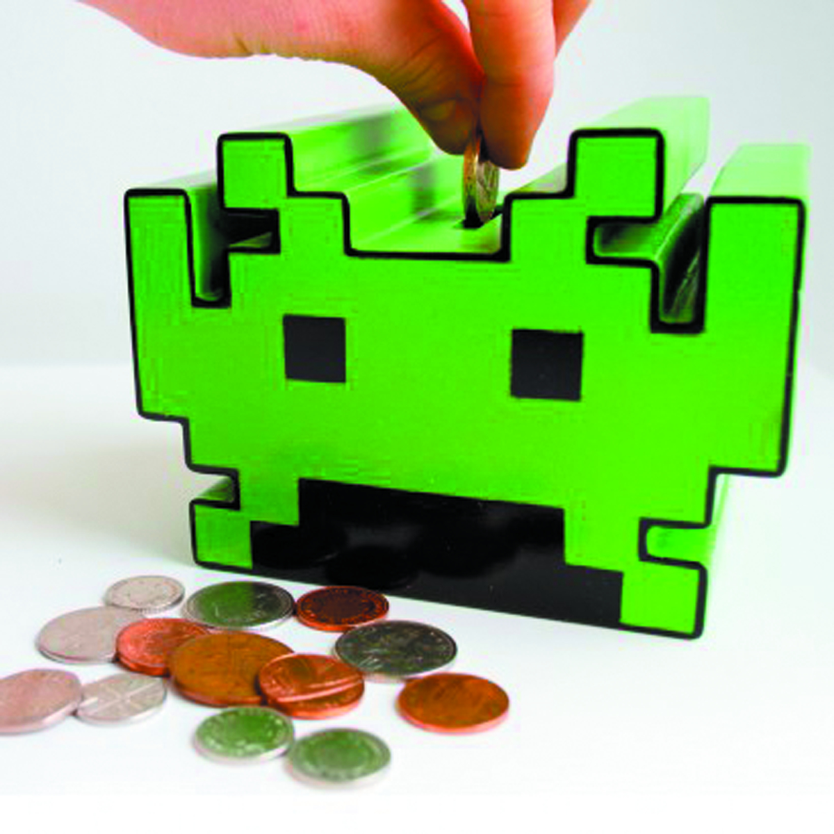 Save money with your favorite Space Invaders retro arcade game character! Put coins into the money box and listen to genuine Space Invader sound effects.