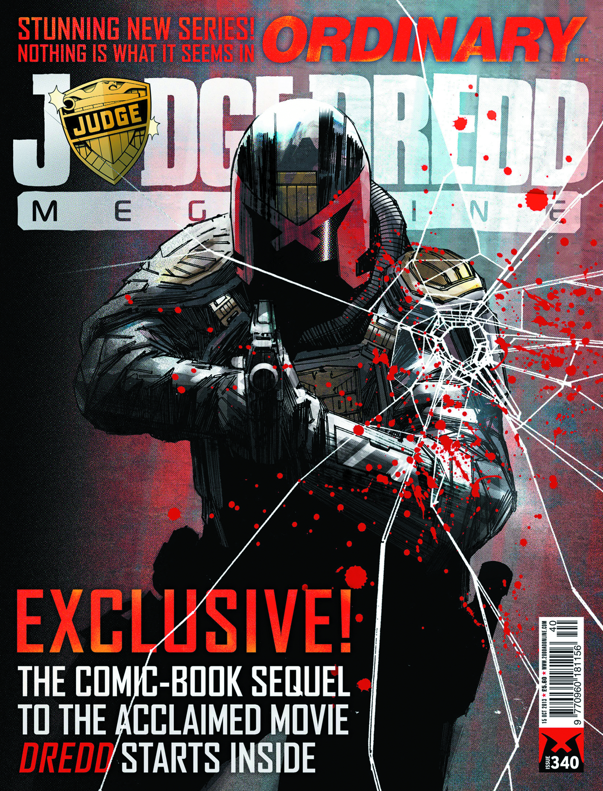 More action and adventure in the future-shocked world of Judge Dredd! Dark thoughts continue to plague Psi-Judge Anderson in "Dead End" by Alan Grant and Michael Dowling; private investigator Galen DeMarco teams up with a mutant to investigate the disappearances in "The Whisper" by Mike Carroll and Steve Yeowell; a sniper causes trouble for Dredd in "Duty Calls" by Alec Worley and Ben Willsher; plus there's more madness in Rob Williams and D'Israeli's Ordinary, the usual articles, stories and more!