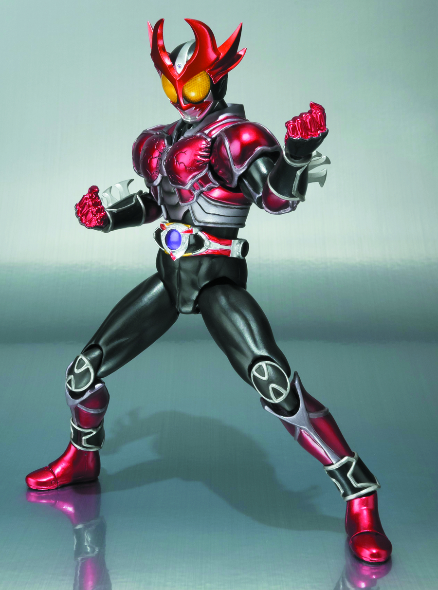 Kamen Rider Agito finally makes his debut in the S.H.Figuarts line! With a distinctly muscular sculpt and crimson metallic armor, the 5 7/8" tall Agito Burning Form is a prime example of the pinnacle of articulation that the S.H.Figuarts line has achieved with its line of highly detailed adult collectibles. Several different sets of hands are featured, allowing Agito to assume his famous fighting poses from the series, and allow you to re-enact your favorite scenes. Two types of Agito's famous Shining Caliber weapon are included, allowing him to hold his weapon in both single and twin bladed modes. Window box packaging.