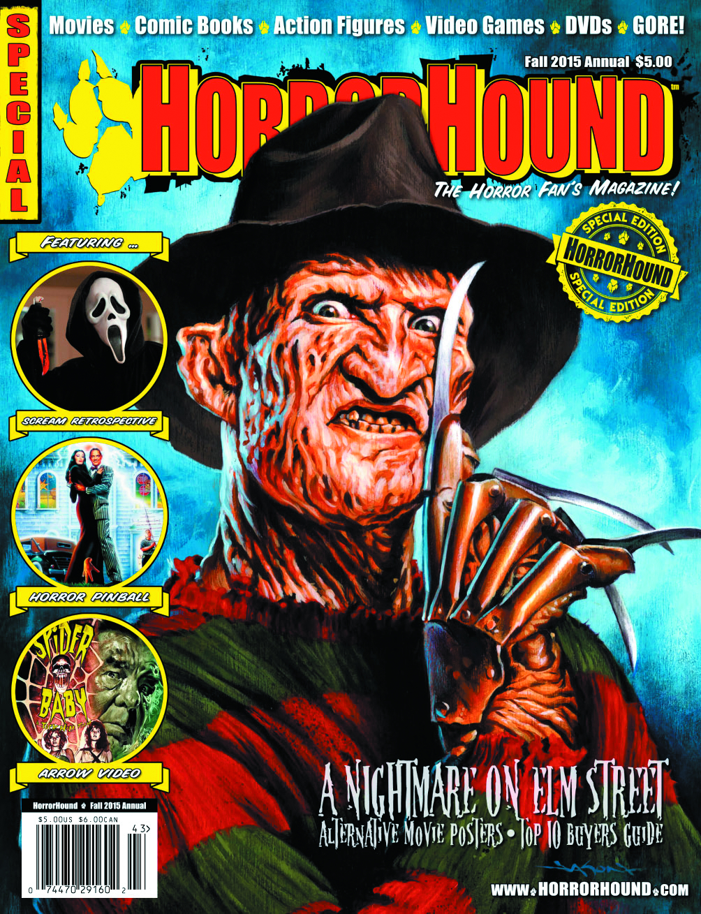 A Nightmare on Elm Street Buyer's Guide, a history of Horror Pinball Machines, a collector's guide to Arrow Video US, and a killer double-sided pull-out poster from artist Nathan Thomas Milliner is included.