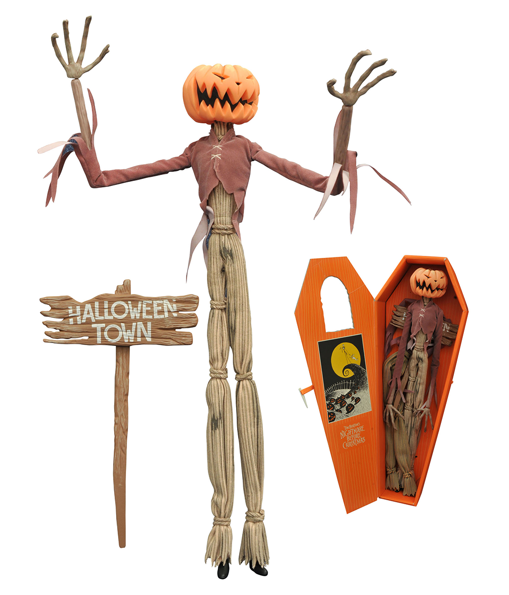 A Diamond Select Toys release! DST continues to re-animate the Coffin Doll line of yesteryear with a new re-issue, this time of Jack Skellington as the Pumpkin King! Wearing his Jack O'Lantern mask and tattered clothes, the Pumpkin King stands approximately 16 inches tall, and features multiple points of articulation. Figure includes a sign for Halloween Town, and comes packaged in a coffin-shaped window box.