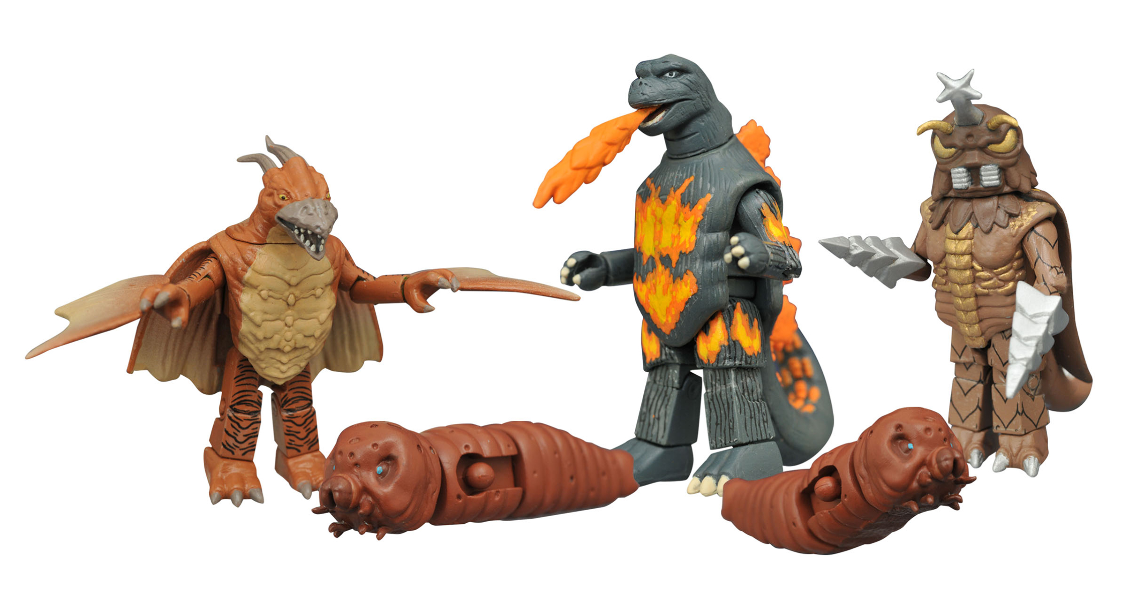 A Diamond Select Toys release! Godzilla is back, and he brought company! This all-new box set of tiny, 2-inch monsters includes a new version of Godzilla, plus four of his greatest friends and enemies! Burning Godzilla features a new orange-tinged paint scheme and removable flame breath, and he comes with all-new figures of Rodan, Megalon and two Mothra Larvae! Each Minimates mini-figure has multiple points of articulation, stands approximately 2 inches tall, and features fully interchangeable parts. Create your own kaiju! Packaged on a full-color blister card. Designed by Art Asylum!
