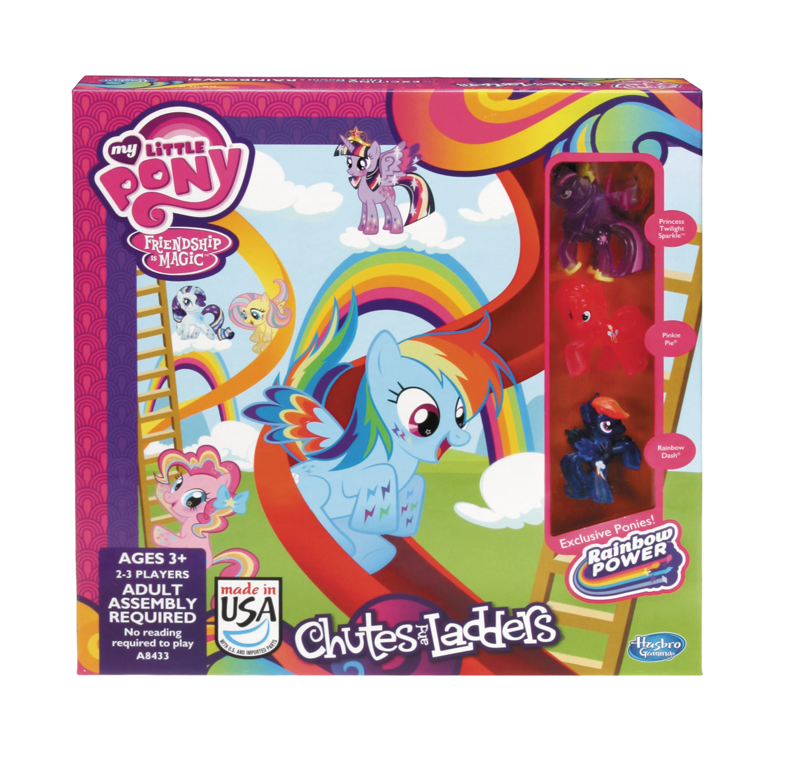 My Little Pony Chutes and Ladders Game. Your favorite characters are ready to take you on a magical journey filled with rainbows, and you decide where the rainbows go on the board. Just insert each rainbow piece into the cloud base and place the rainbows where you want them. If you spin a special rainbow spot on the spinner, you get to go directly to the closest rainbow. If there are no more rainbows on the board, flip the Gem Coin. If it lands on the rainbow side you get to move to Square 100 and win the game. There's nothing like rainbow power! Includes gameboard, 3 My Little Pony pawns, spinner with arrow, 3 rainbows, 3 cloud bases, 1 gem coin, rainbow label sheet, and instructions.