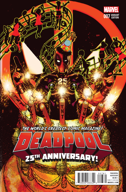 From Marvel Comics. Twenty-five years ago in February 1991, the New Mutants encountered a blabber mouthed mercenary who tore through Xavier's mansion and into the very heart of the 1990s. Now, that self-same degenerate is one of the most popular heroes in the world, an Avenger, and maybe the smelliest and grossest person that Tumblr swoons over. Come see how Deadpool reacts to life at the top of the world...(hint: he does not handle it well). Plus: A full array of stories from Deadpool's new allies, the members of the Mercs for Money! Oh ... and I think there is, like ... some other Deadpool thing this month people are excited about? I forget what. Parental Advisory. Scheduled to ship 02/03/16. (161)