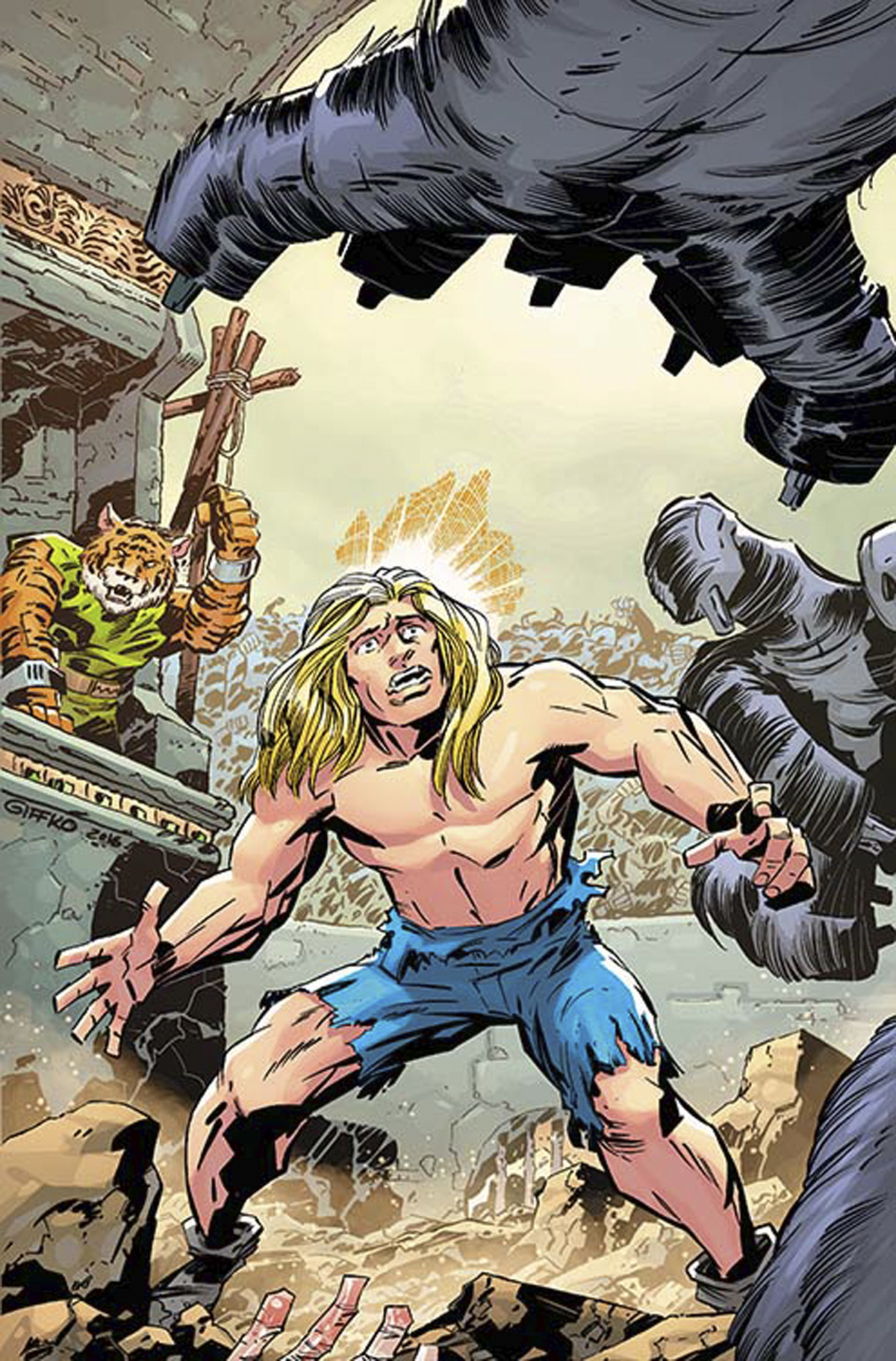 Each issue will end with an unimaginable cliffhanger, and it's up to the next creative team to resolve it before creating their own. It's a challenge worthy of "The King" himself! In this premiere issue, the Last Boy on Earth is dragged from his safe haven by a group of tigers, only to face the nightmarish threat of the ultimate weapon!