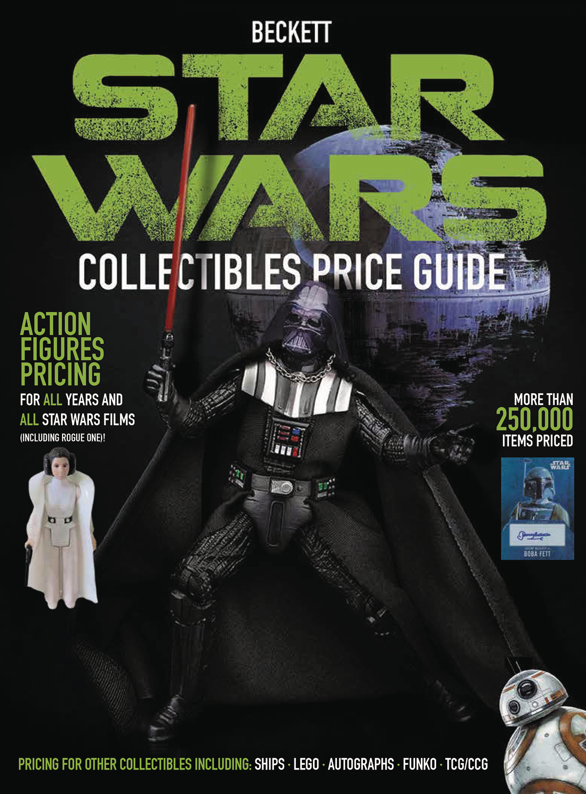 This premiere Star Wars Collectibles price guide book will include pricing for the most collectible Star Wars figures dating from 1977 through the early releases of the upcoming Rogue One film, and will include vintage and modern pieces for all years and all Star Wars films, as well as for ships and playsets. With 256 inside pages, it will be among the biggest Star Wars price guides in the galaxy.