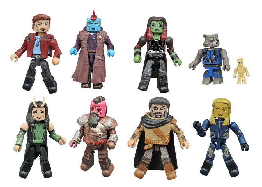 A Diamond Select Toys release! The greatest mix-tape in the galaxy is back! The unlikely team of misfits known as Marvel's Guardians of the Galaxy is coming back to our solar system with a new movie, and DST is marking the occasion with a new assortment of Minimates based on the film! Four new two-packs capture the main cast in 2-inch mini-figure form: Starlord pairs with Yondu, Gamora with Rocket and Groot, and two comic-shop-exclusive sets feature Ego with Ayesha and Taserface with Mantis. Each Minimate features up to 14 points of articulation and fully interchangeable parts, and each 2-pack comes in a full-color window box. You're welcome!