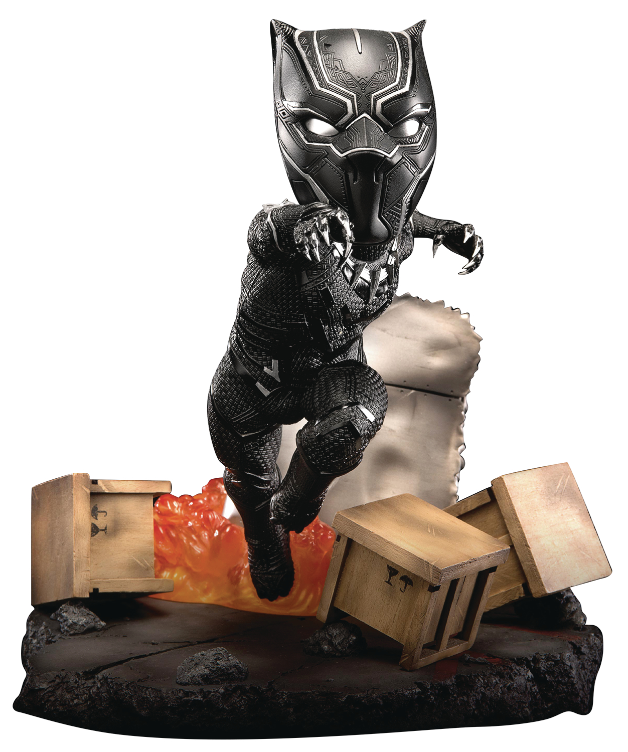 Black Panther, featuring a black painted helmet and suit with highly detailed textures and metallic detailing. This Black Panther figure is paired with a stand featuring debris and box props to recreate the climactic airport battle scene from the film!