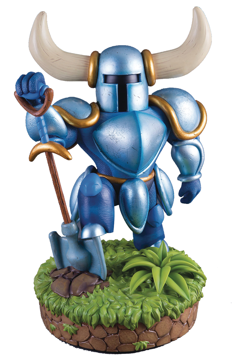 Shovel Knight lives by the creed of: Slash Mercilessly and Dig Tirelessly! Even with his small stature, he has won many battles by using his quick thinking and ingenuity. With his trusty weapon, the Shovel Blade, Shovel Knight can do almost anything. Shovel Knight comes pearched atop a highly detailed base inspired from The Plains, also known as the Plains of Passage straight from the first stage in the game and an Authentication Card.
