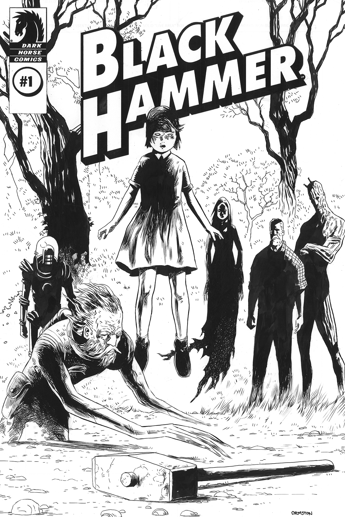 This deluxe, director's cut showcases high res, uncleaned scans of Dean Ormston's beautiful inked line art from the first issue of the award-winning Black Hammer series, with Todd Klein's lettering overlayed on top, and also Jeff Lemire's original script, and a high res scan of the original cover.