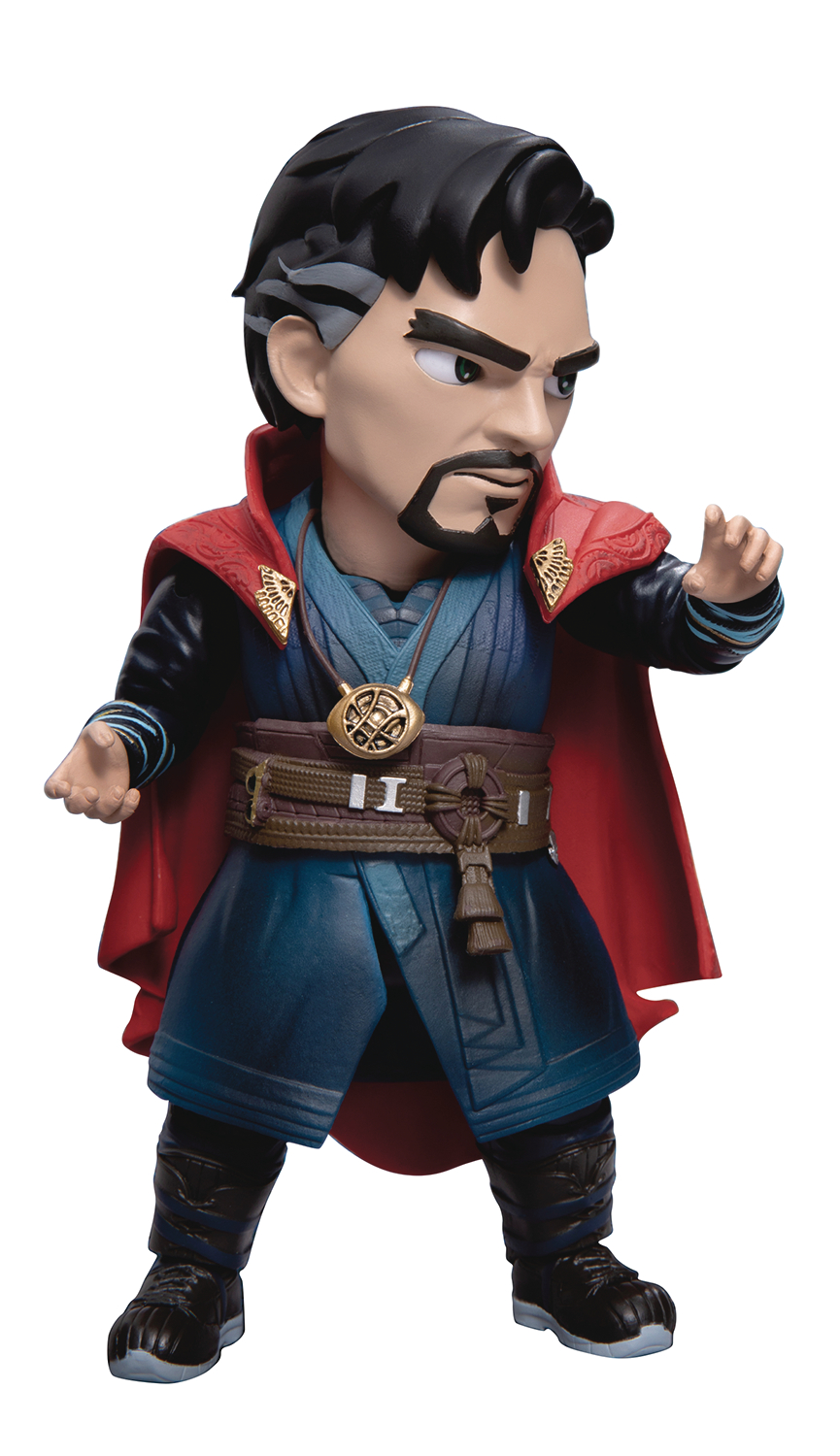 Doctor Strange who is ready to fly into action and save the universe from annihilation! Beast Kingdom proudly presents the latest EAA based on the once famous, yet egotistical surgeon turned magical avenger and sole protector of the Time Stone. Take flight with the distinct Egg Attack Action styling, and use the levitating cloak and 26 points of articulation to soar high in the sky, all the while stocking up on magical weapons including the sacred sword of Vishanti and the Crimson Bands of Cyttorak ropes as well as wrist bolts! Exclusive to the EAA-072, channel the extra-dimensional energy to multiply the doctor's arms in the Image of Ikonn, ready for teleportation and time manipulation and with the included accessories, create mystic shields for protection or spells using the included divine medallion: The Eye of Agamotto. With a host of new accessories and options the