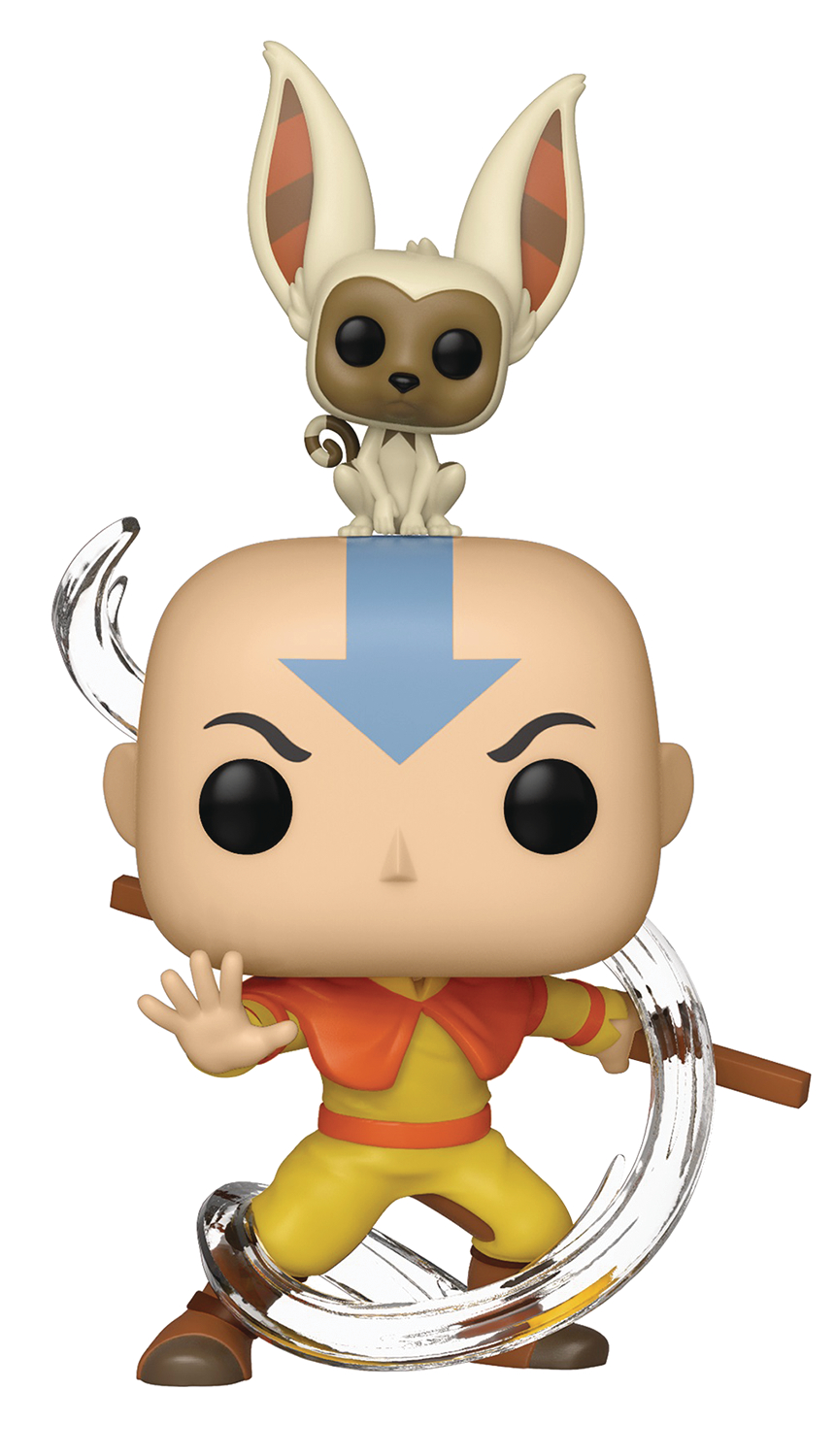 Aang and his winged lemur companion Momo on their mission to end the Hundred Year War and bring peace to the Fire Nation, Water Tribes, Earth Kingdom and Air Nomads. POP!