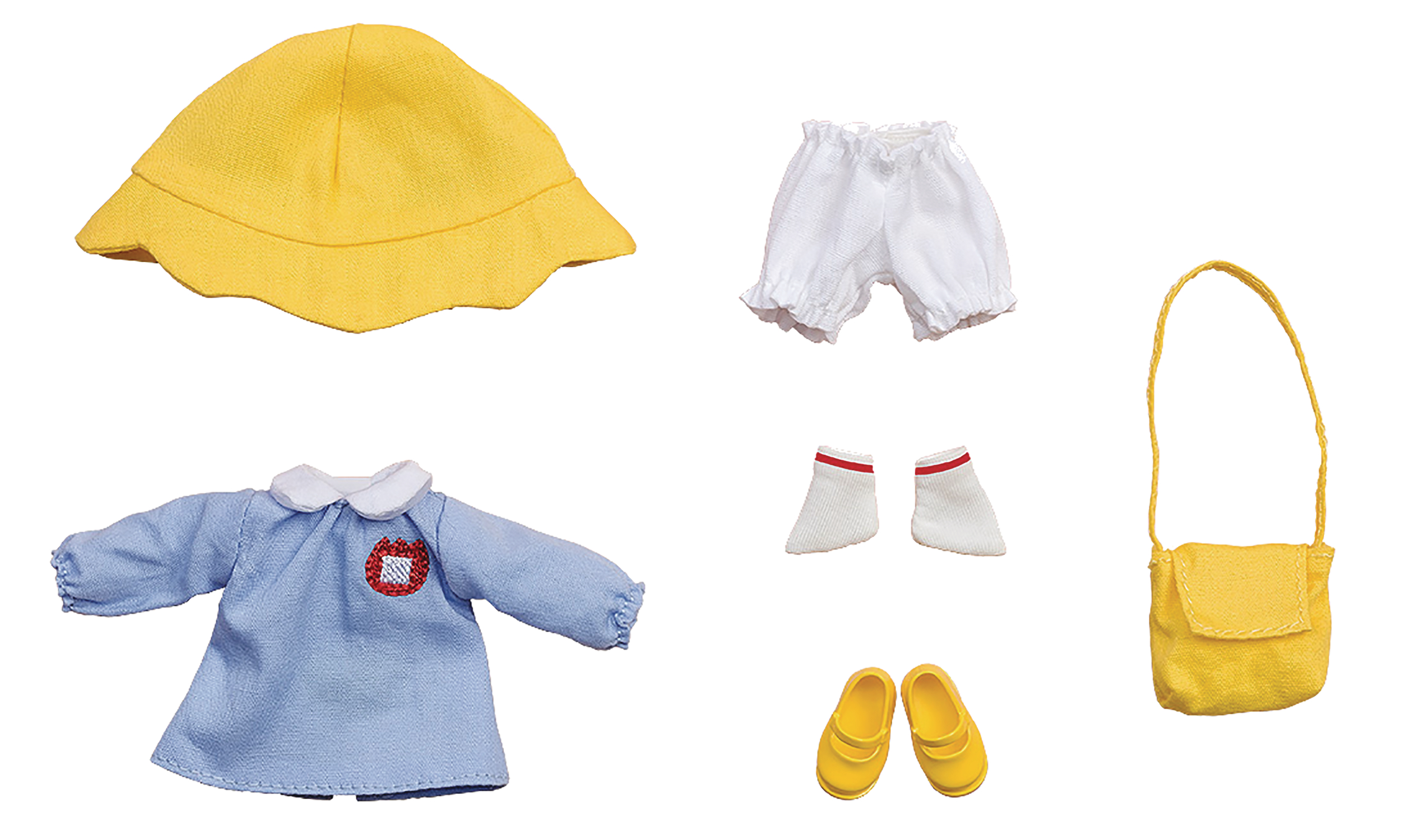 From Good Smile Company. An outfit set for use with your Nendoroid Dolls! Mix and match with your Nendoroid Dolls! This set contains: A Hat, Bag, Smock, Undergarments, Socks, and Shoes. (With Magnets in Soles)
