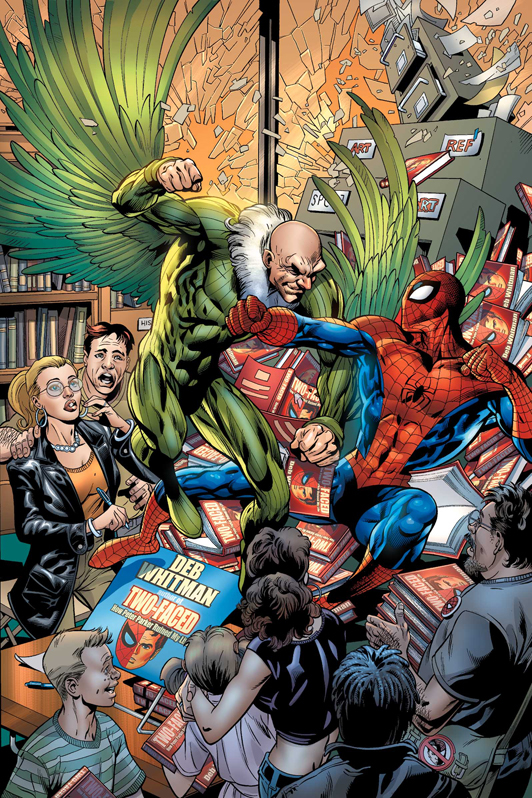 Watch out, you latt -sipping, bookmark-bending, literary snob! Spider-Man and the Vulture are bringing a whole new meaning to the term "Battle of the Books" as they duke it out in a bookstore! And stuck right in the middle, dodging hardcovers, is poor Deborah Whitman, author of a memoir detailing her tumultuous relationship with Peter Parker. Whoever invented that old saying about words not hurting as much as sticks and stones obviously hasn't lived a day in the webslinger's boots!