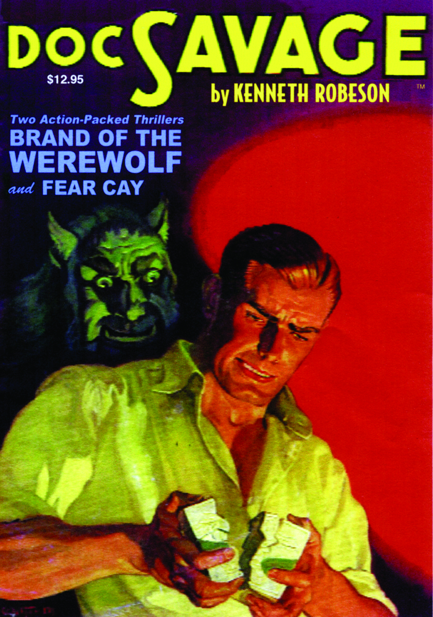 The pulp era's greatest superman teams up with his beautiful cousin in the Lester Dent novels that introduced the character of Patricia Savage. First, the Man of Bronze and his Iron Crew investigate the murder of Doc's uncle. The only clues, a strange ivory cube and the mysterious "Brand of the Werewolf" set them on the trail of an ancient mystery. Then, after a failed kidnapping attempt, Doc and Pat Savage travel to the West Indies and encounter flesh-eating ants and a 130-year-old man on the strange island called "Fear Cay." This collector's item pulp reprint features the classic color pulp covers by Walter Baumhofer, interior illustrations by Paul Orban, and historical articles by Will Murray, author of seven