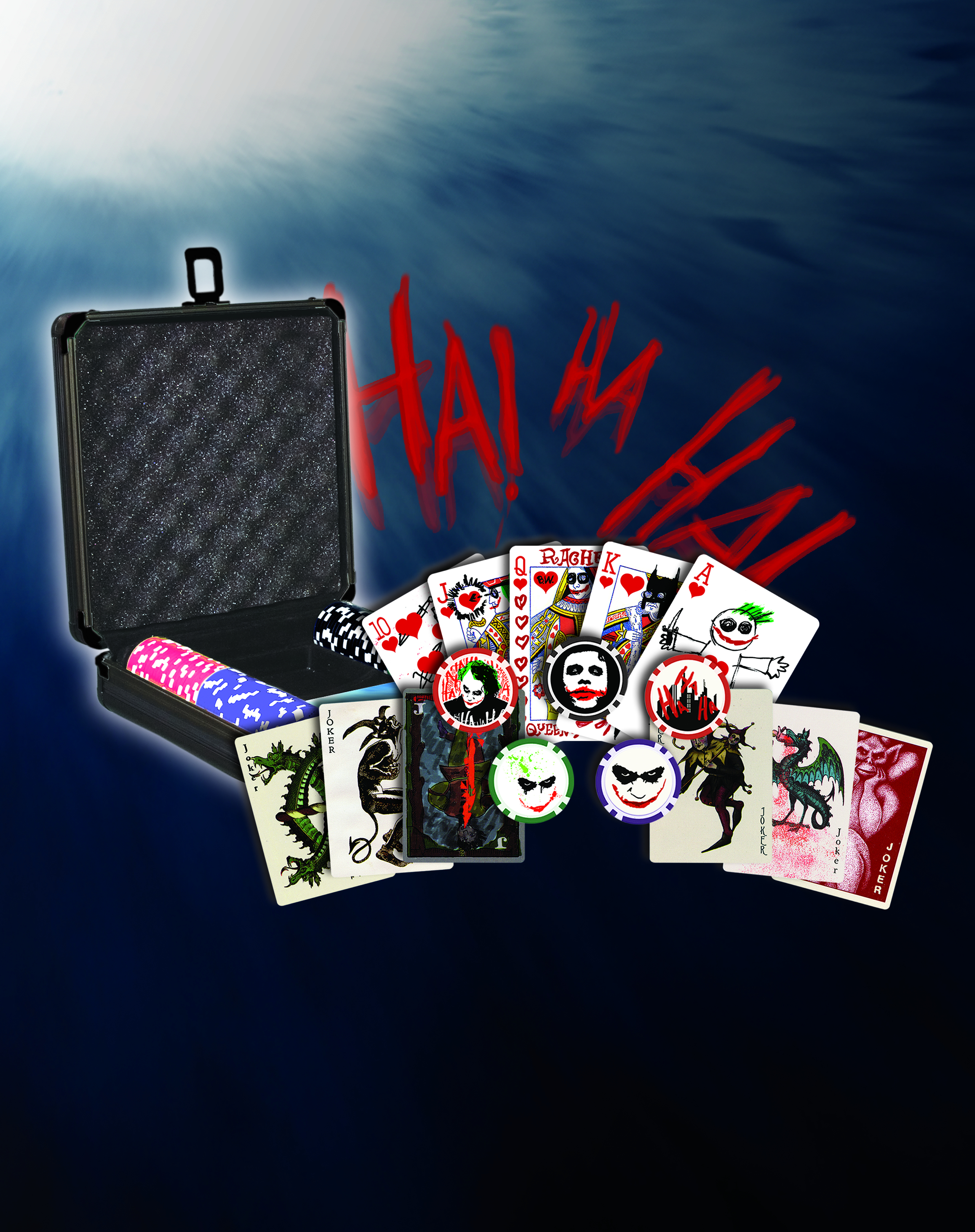 This unique collectors' item includes a deck of 54 prop replica Joker cards (as seen in The Dark Knight film!) and a standard "playable" 4-suit, 54 card deck defaced by The Joker. Also included are 100 4-color poker chips in Joker-themed colors of green, purple, red and black, and 5 dice. The entire set comes housed in a black aluminum carrying case (which locks to prevent The Joker from defacing the second set of cards!), and the case is packaged in a 4-color box. A 4-color Certificate of Authenticity is also included and appears as one of the playing cards!