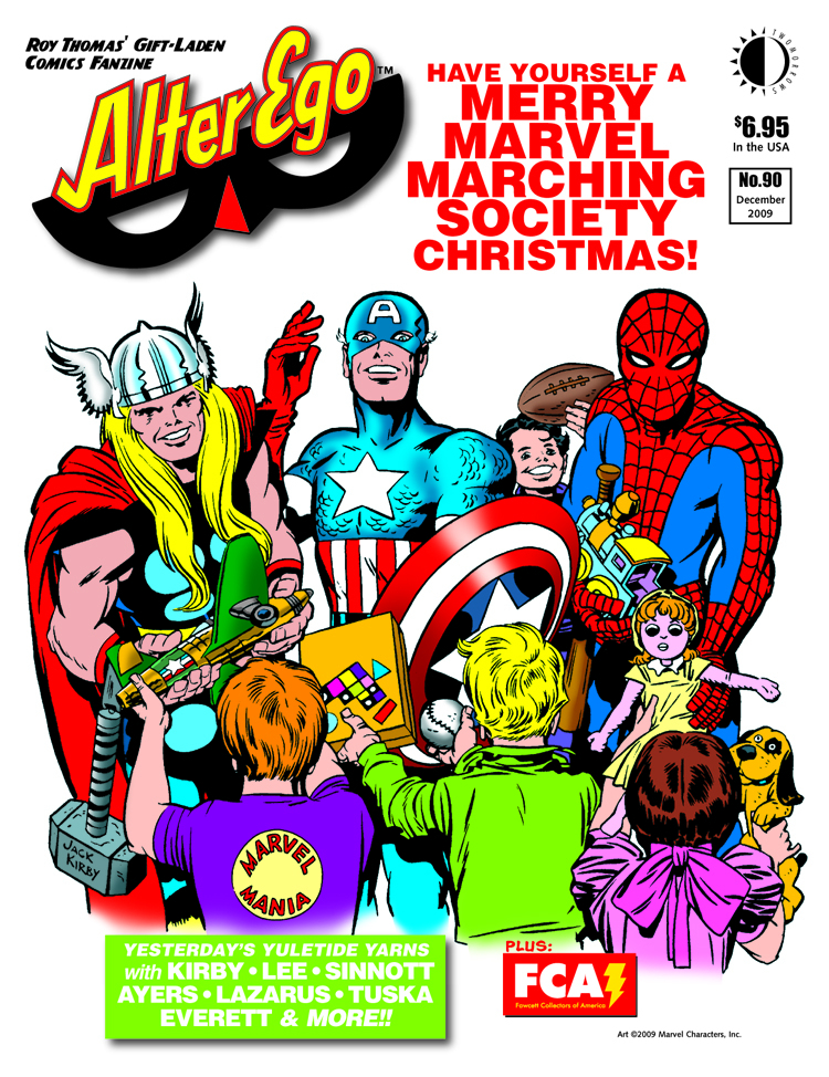 Alter Ego #90 presents a Big MARVEL Issue! Have a Merry Marvel Marching Society Christmas starting with a Jack Kirby holiday cover, and featuring special salutes to Marvel legends Joe Sinnott and Dick Ayers, plus the likes of Stan Lee, George Tuska, Bill Everett, and Martin Goodman. Also included is a glimpse at the "Marvel Super-Heroes" TV animation of 1966, plus late 1940s Timely writer and editor Leon Lazarus is interviewed by Jim Amash.