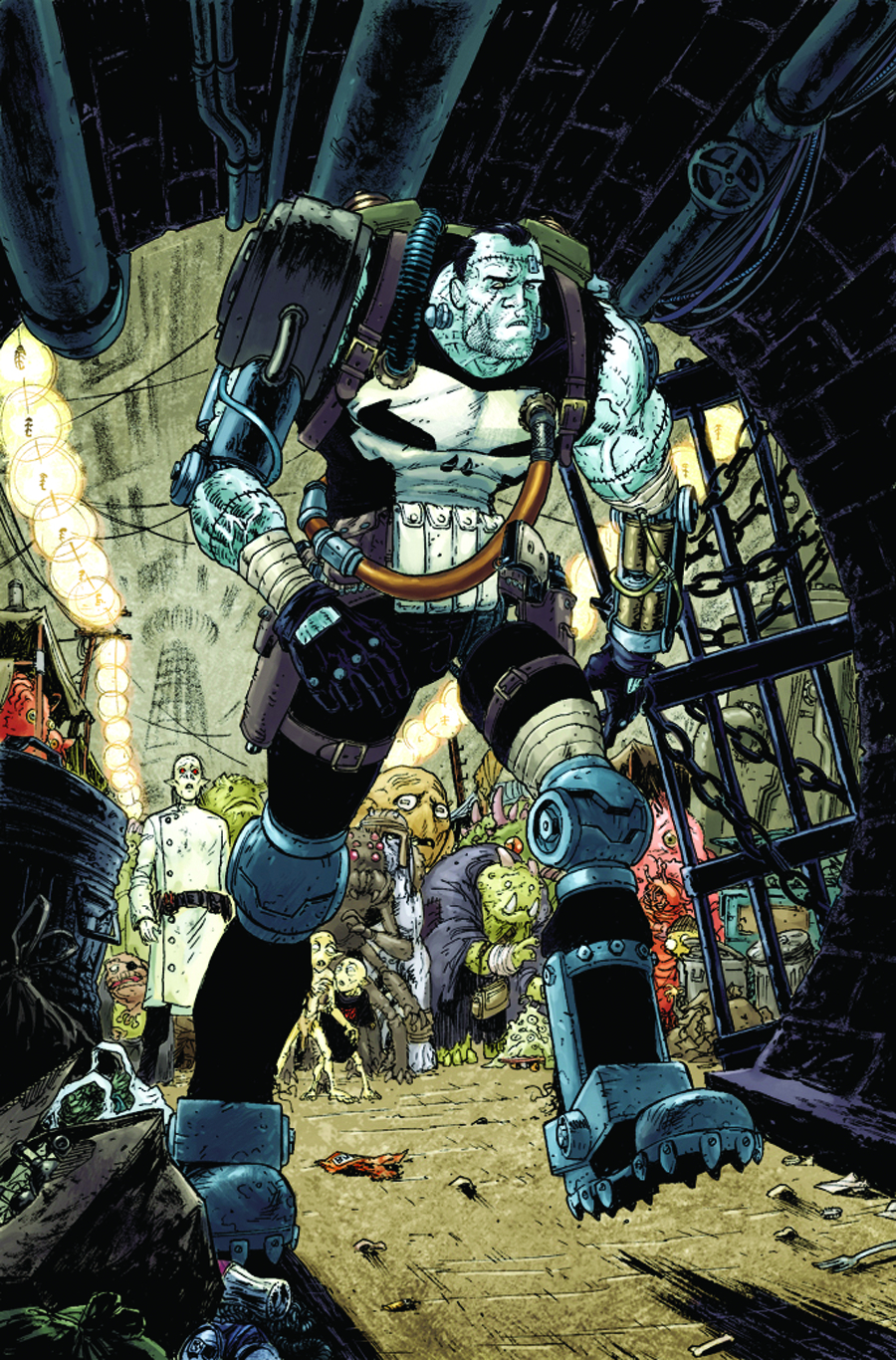 From Marvel Comics. "Franken-Castle" Part 1-In the belly of New York, skulking and forgotten creatures of the night uncover the remains of a man in a familiar outfit. Frank Castle is dead. What exactly is Frankencastle? Longtime collaborators Rick Remender and Tony Moore (