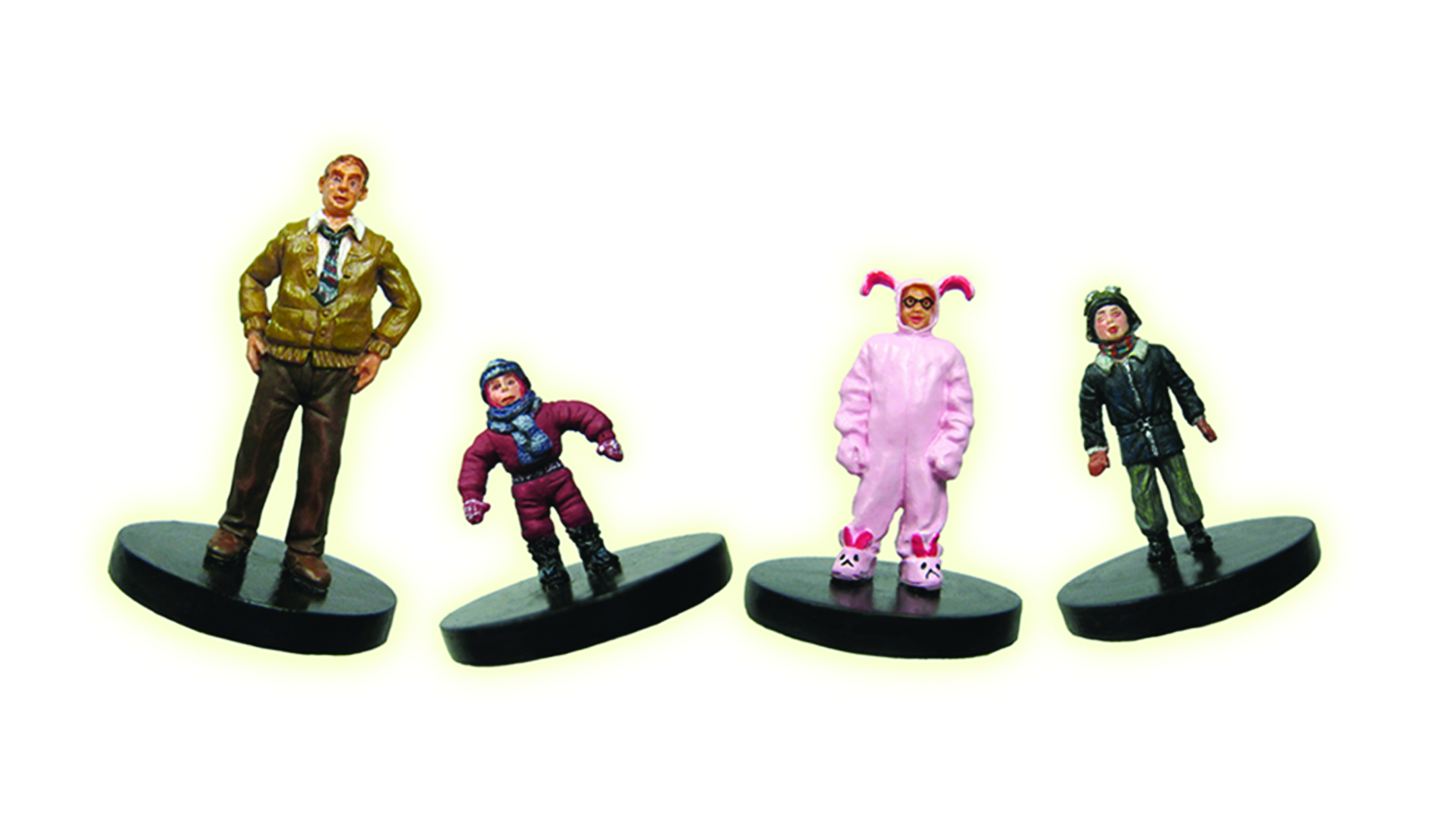 A Christmas Story! Players choose one of four high quality painted miniatures (Ralphie in Bunny Suit, Randy, Flick, and the Old Man) and navigate the nostalgically designed game board full of classic movies scenes and quotes. A variety of social party activities keeps the game new and exciting every time.