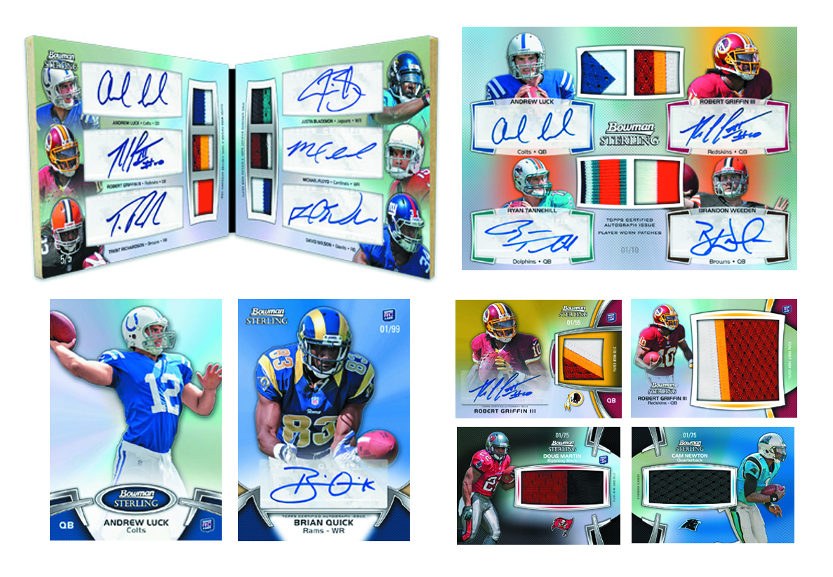 Bowman Sterling is coming out bigger and better than ever before. We've trimmed the fat from past releases and reconfigured the 2012 edition to introduce better box guarantees, bigger relic swatches, more patch hits, a greater focus on top rookies, and an overall improved look and feel to an amazing technology and design! Every pack delivers 3 rookie cards, 1 rookie autograph, and 1 Jumbo rookie or veteran relic card. The 100-card base series is supplemented with numbered Parellel cards (Blue, to 99; Black, to 75; Gold, to 50; Prism, to 25; SuperFractor, 1/1, and Unframed Printing Plates, 1/1). 5 cards per pack (3 Rookie base, 1 Rookie Autograph, 1 Jumbo Relic), 6 packs per box.