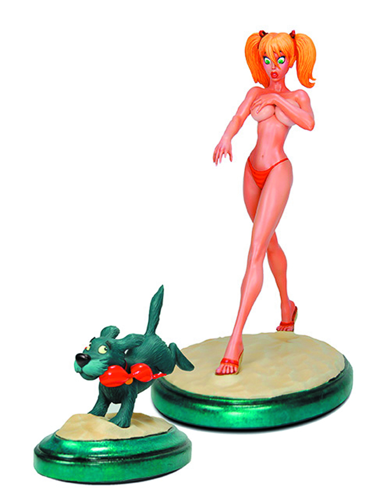 Clayburn Moore brings award-winning animator Dean Yeagle's vivacious pinup dream girl Mandy to life in this limited-edition 1/6 scale statue from The CS Moore Studio. The 10 1/2" tall piece perfectly captures a surprised Mandy covering herself as she reaches after her mischievous dog Skoots, who has just absconded with her bikini top. Naughty Skoots!