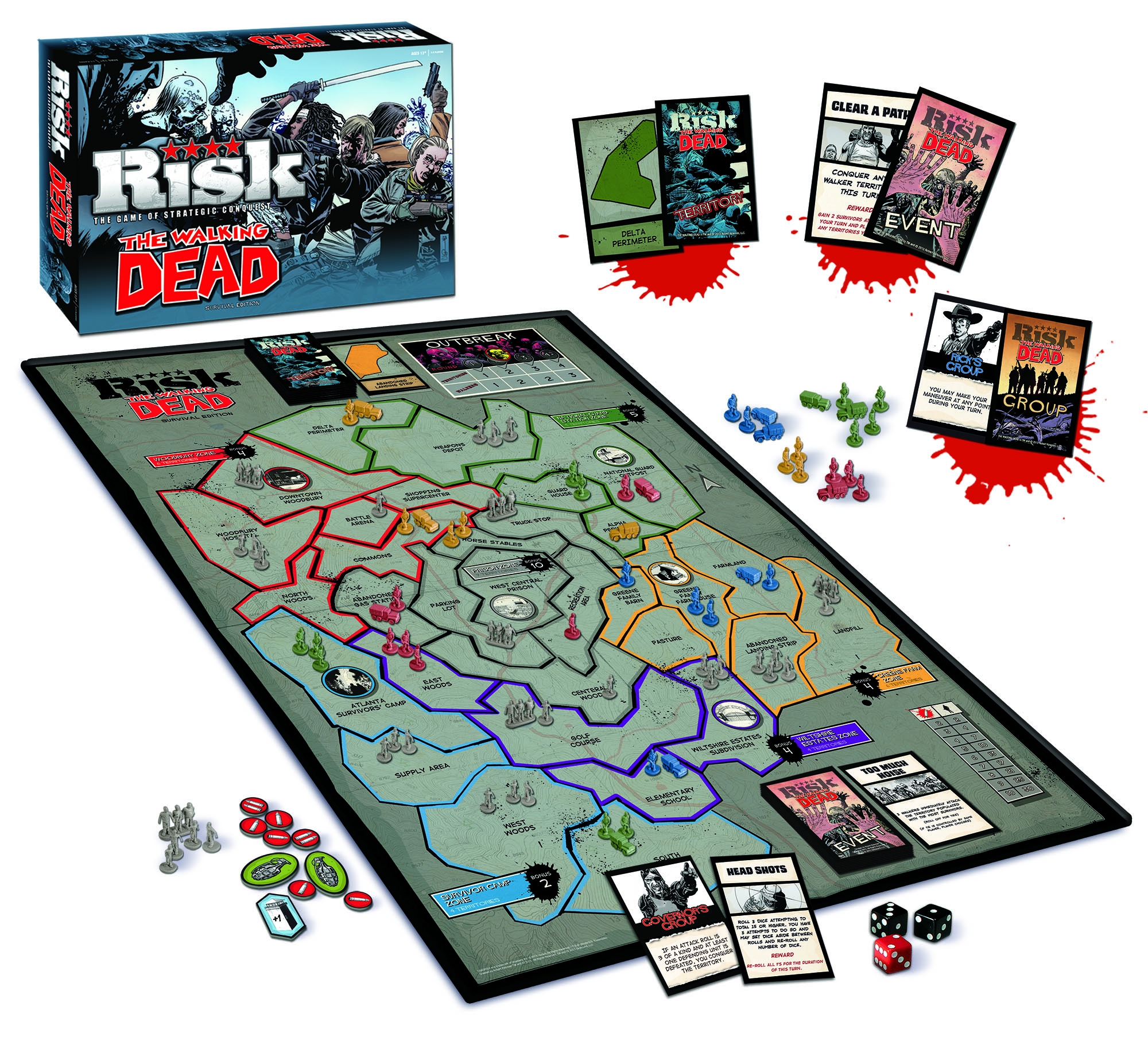 Risk game play. USAopoly is proud to debut a brand new map set in the southeast region of the United States where players battle and scavenge for their very lives. Contending for survival at every turn, gamers must not only fend off attacks from the living who compete for precious, limited resources upon which their survival depends, but they also must maintain their self-preservation from the unrelenting hordes of the undead that would feast upon them. Gamers can expect a fast-paced game of attrition and survival, where the last man standing wins!