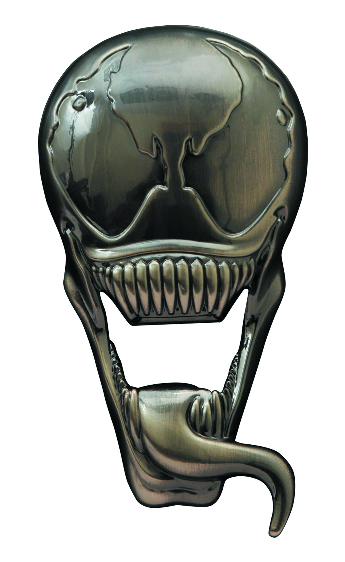 A Diamond Select Release! Thirsty for vengeance? Have a cool beverage instead, courtesy of this solid metal bottle opener in the shape of Eddie Brock, a.k.a. the Spider-Man villain called Venom! Just wrap his teeth and tongue around the bottlecap of your drink of choice and voila - that thirst goes away, perhaps replaced by a hunger for juicy brains. Measuring just under 4 inches tall, this metal opener has a polished chrome finish, as well as magnets on the back to keep him on your fridge, plotting revenge. Comes packaged in a collector case with full-color slipcover.