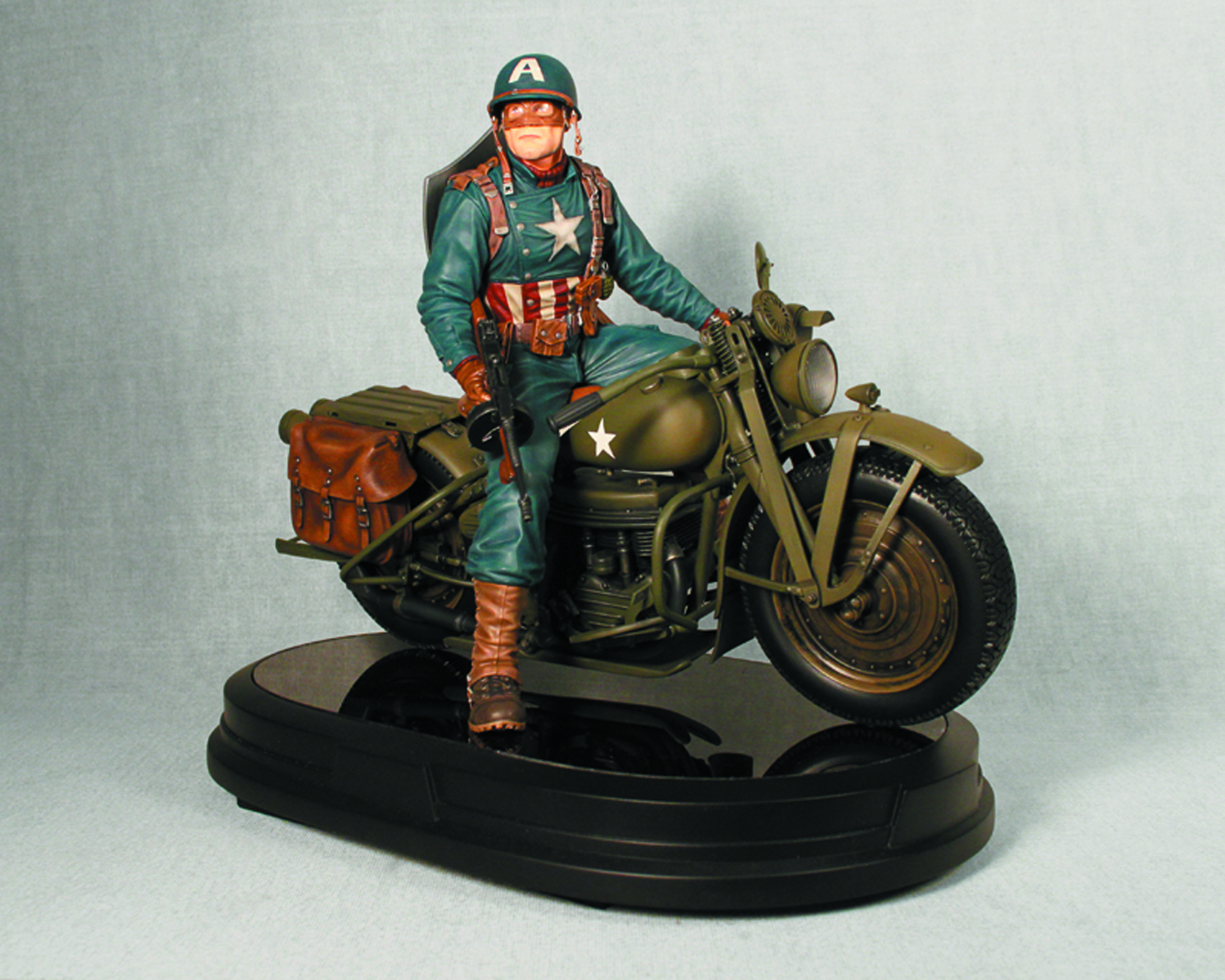 The Ultimates comes the World War II-era Ultimate Captain America on his motorcycle! In the Ultimate Universe, Steve Rogers undergoes the Super Soldier treatment, but unlike his Earth-616 counterpart, he gains superhuman strength, speed, agility and even an enhanced healing factor! He truly is an Ultimate hero. Armed with his signature heater-shaped star-spangled shield and Tommy gun, Steve Rogers is ready to report to the front! No detail has been overlooked in the creation of this statue, from the individually crafted parts of the era-authentic army-issue motorcycle to the paint on his removable combat helmet. This statue is a centerpiece for fans of the mainstream Marvel Universe and Ultimates alike!