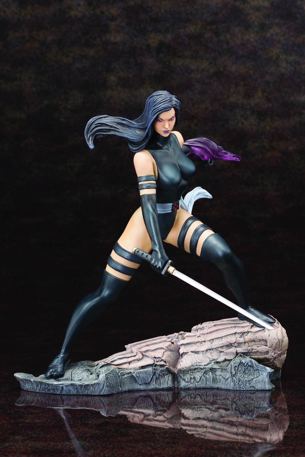 Sculpted by Erick Sosa, Psylocke stands over 10 inches tall on her georama base in 1/6th scale with the other X-Force Fine Art Statues.  Get her while you can before this psychic ninja disappears!