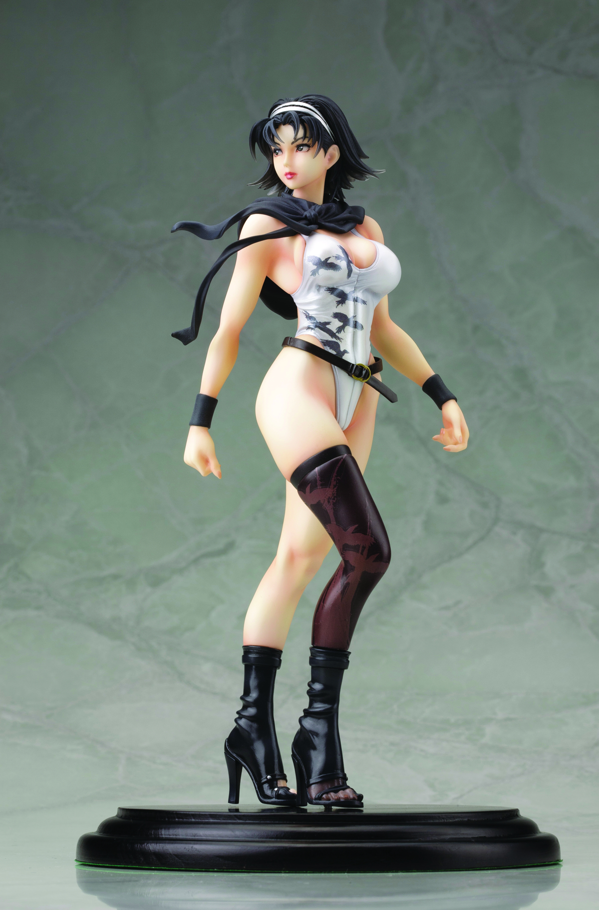 Unlike some of the other more action-oriented Tekken Bishoujo beauties, Jun Kazama strides forth confident and relaxed, yet ready for a fight. The fierce competitor is captured in a very subtle walking pose that looks fantastic, showing off her grace with her head held high and looking at you over her shoulder. Jun wears an interesting outfit consisting of black high-heeled boots, one thigh length stocking, a dynamic white bodysuit, and a short scarf. She accents that ensemble with a thin belt, bracelets, and a hairband, and the intricate bird print on her suit matches that on her stocking. Jun's beauty cannot be contained, from her lithe body to her entrancing Bishoujo inspired face!