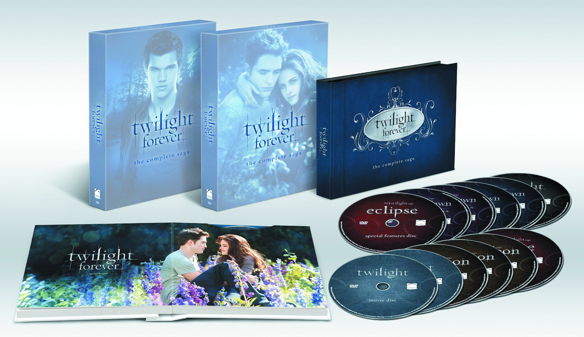 Twilight Forever: The Complete Saga, available as a 10-disc Blu-ray set (plus UltraViolet digital copy), or as a 12-disc DVD set (also with UV digital copy).