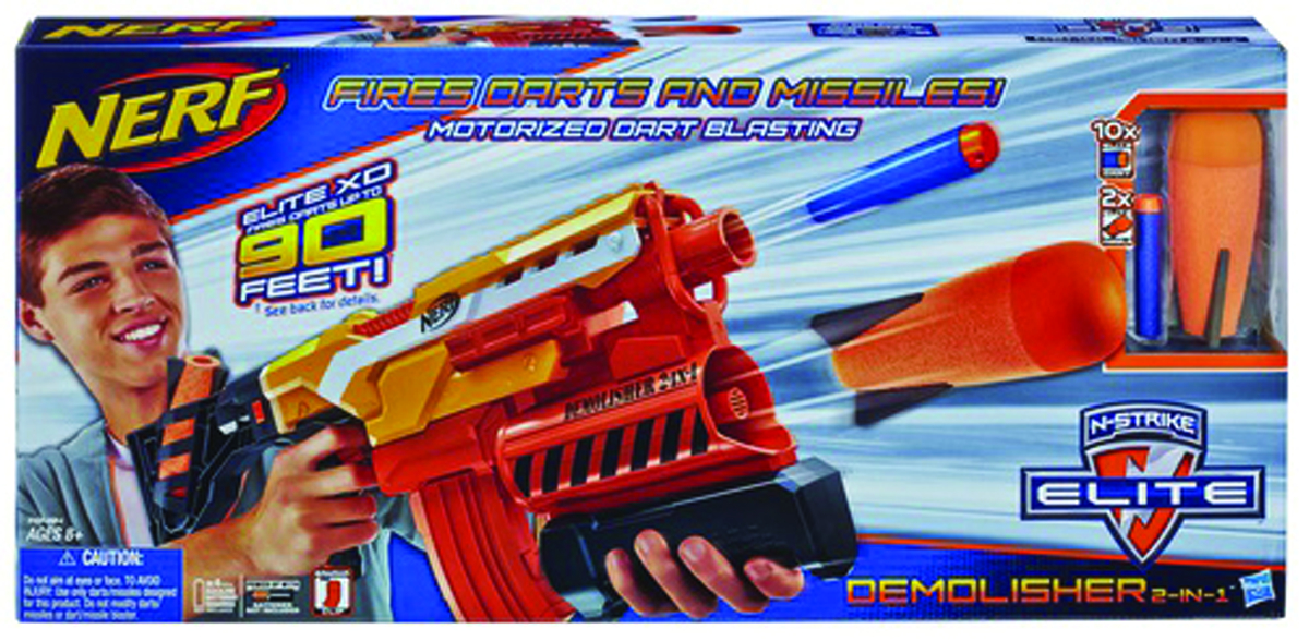 Launch 2 types of ammo at your target with the Demolisher 2-in-1 blaster! This blaster has a maximum impact whether you're blasting big missiles with pump-fire action or unleashing a powerful barrage with motorized blasting. If you're in the mood to demolish the competition, you can fire both at once! Store your missiles in the detachable stock. You'll dominate the battlefield with the Demolisher 2-in-1 blaster! Includes Demolisher 2-in-1 blaster, stock, 2 missiles, clip with 10 Elite Darts, and instructions.