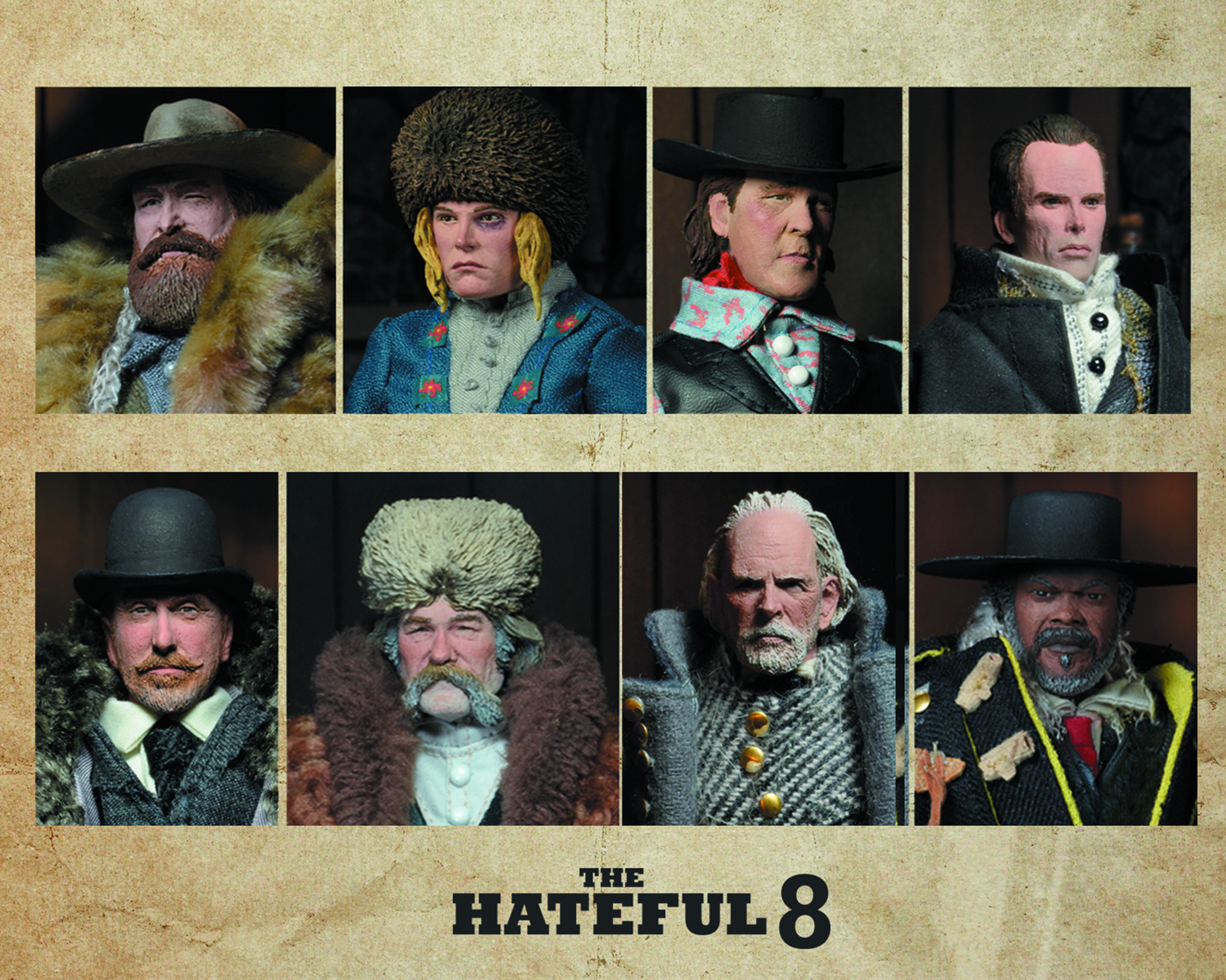 The Hateful Eight, and is a limited edition release; only 3,000 of each will be made available globally. Each fully articulated figure stands 8" tall and is dressed in intricately tailored fabric clothing, similar to the iconic toy lines of the 1970s. All feature authorized likenesses, and come with character-specific accessories from the movie, like pistols, rifles, shackles, gun belts, holsters, and more, in window box packaging. Look for