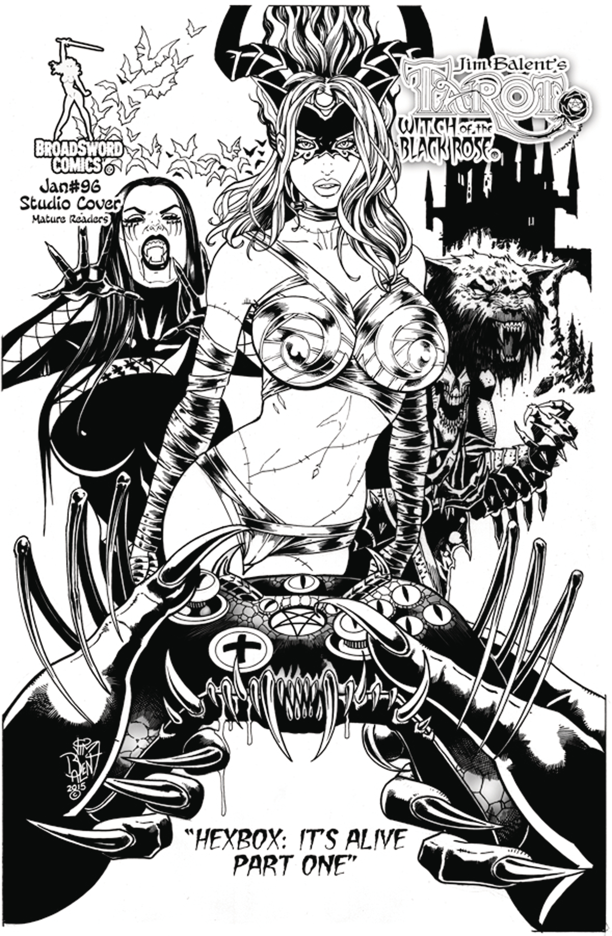 Tarot #96 features the elegant inks of Jim Balent's black & white version the epic "Hexbox" storyline! This collected set will be bagged & boarded with an art print of the same illustration in a full color version but with Tarot Skyclad. To see art print visit jimbalent.com.