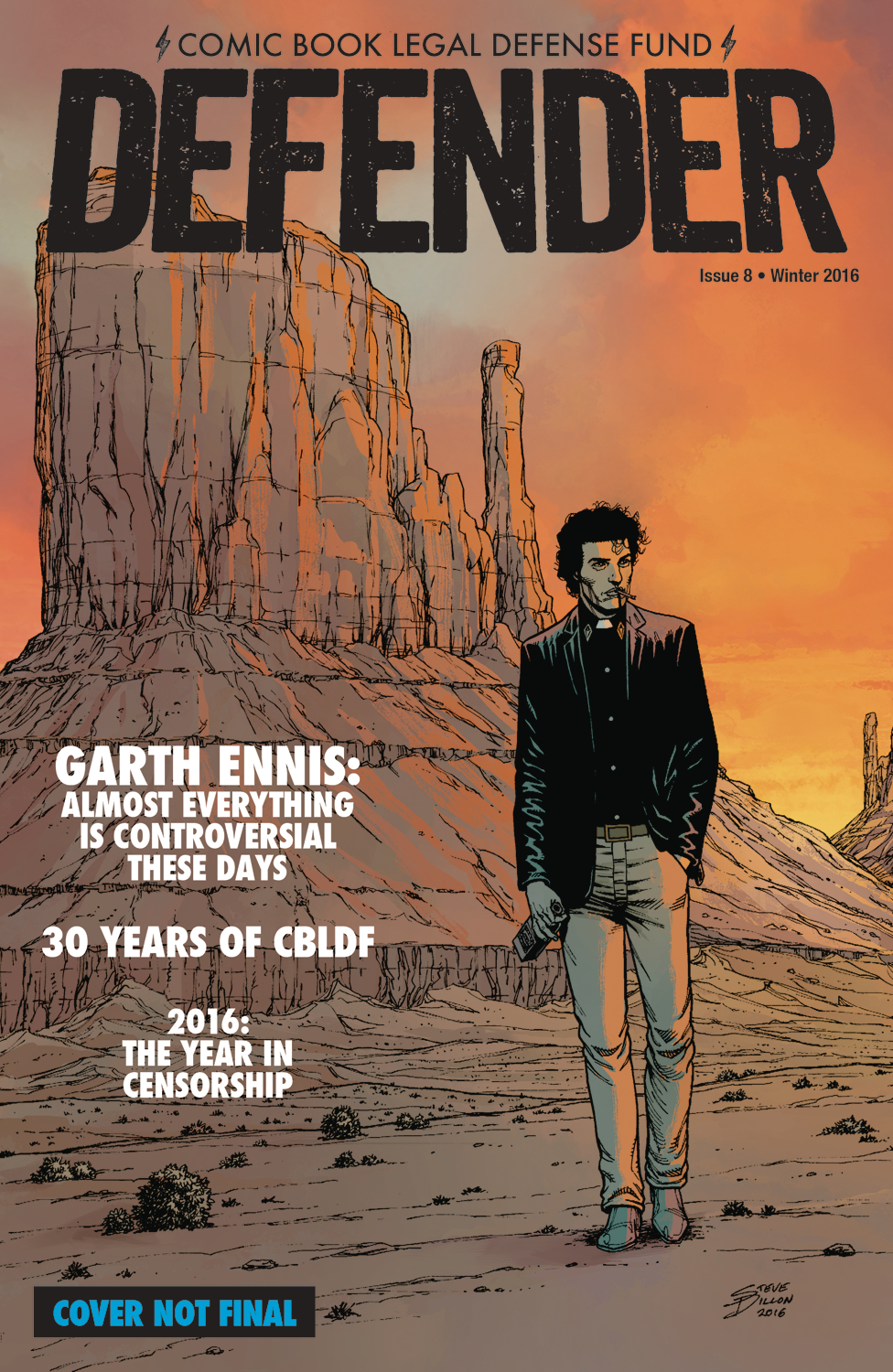 Time of the Preacher! Controversial scribe Garth Ennis talks in-depth on censorship, politics & more in our cover interview! Look back on CBLDF's three decades protecting comics, including the biggest censorship stories of 2016! CBLDF protects your rights, learn how, and how you can get involved in